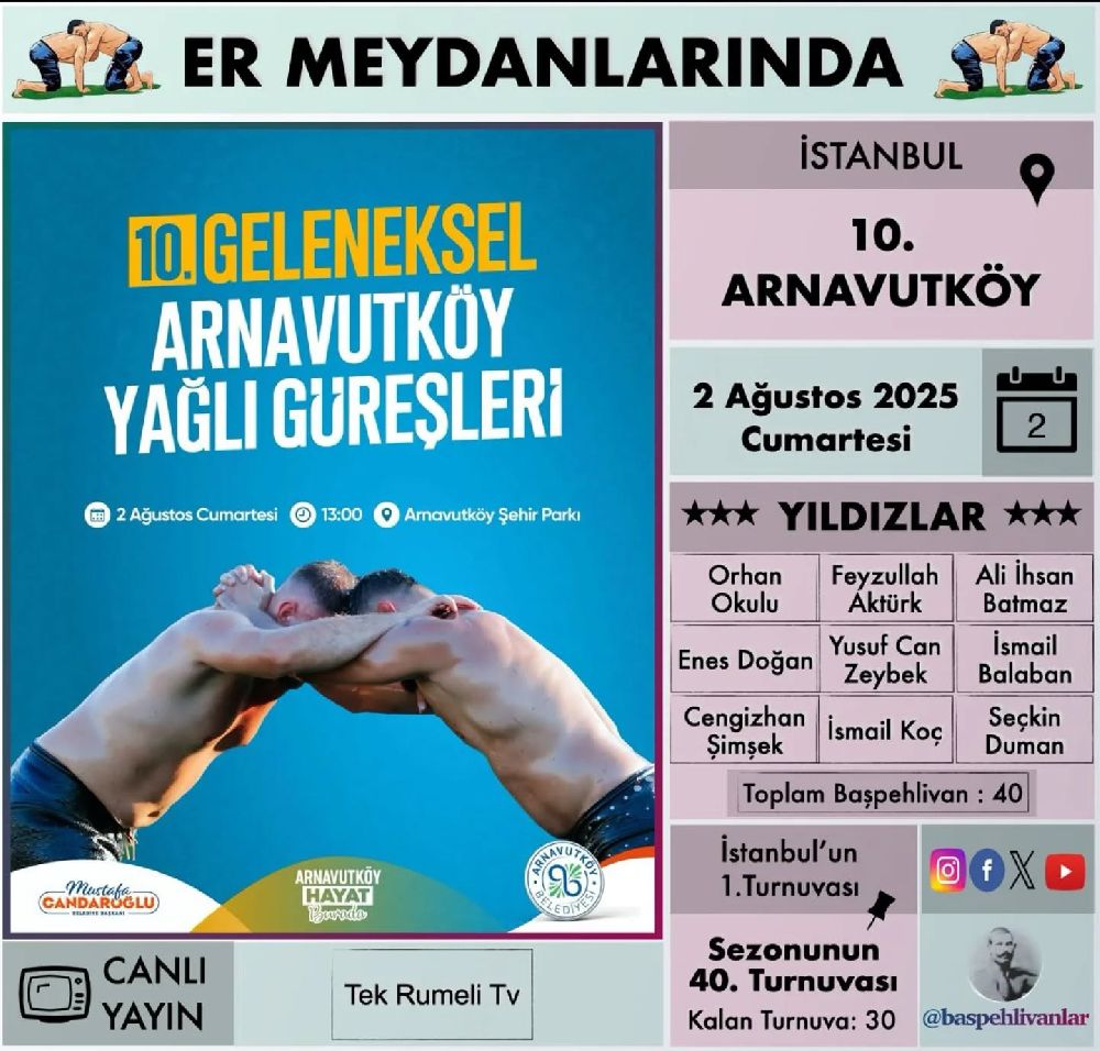 Sezonun 40. güreşi olan 10. Arnavutköy Yağlı Güreşleri, 2 Ağustos 2025 Cumartesi günü İstanbul Arnavutköy’de gerçekleştirilecek. Yağlı güreş tutkunlarının büyük ilgi göstermesi beklenen organizasyon, Türkiye’nin önde gelen başpehlivanlarını bir araya getirecek.
