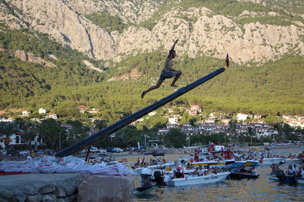 Kumluca'da Kabotaj Bayramı etkinliklerinde yağlı direkten bayrağı alan kişiye verilecek 10 bin TL ödül için yarışmacılar kıran kırana mücadele etti. Kaburga ve kafa gibi değişik yerlerini direğe çarparak yaralanan yarışmacılar ambulans ile hastaneye kaldırıldı.
