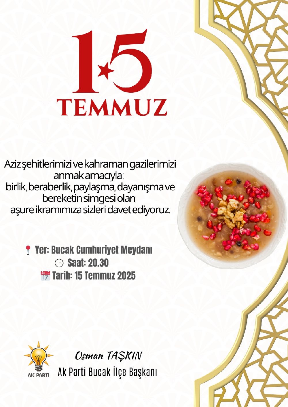 AK Parti Bucak İlçe Başkanı Osman Taşkın, yaptığı açıklamada tüm Bucak halkını programa davet ederek, “15 Temmuz, bu milletin yazdığı en onurlu destanlardan biridir. Şehitlerimizi rahmetle, gazilerimizi minnetle anıyoruz. Bu anlamlı günde, birlik ve beraberliğimizi aşure bereketiyle paylaşmak için tüm vatandaşlarımızı Cumhuriyet Meydanı’na bekliyoruz.” ifadelerine yer verdi.