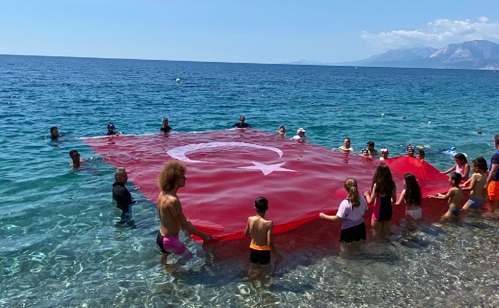Antalya’da 19 Mayıs Atatürk’ü Anma Gençlik ve Spor Bayramı nedeniyle dalgıç ve yüzücüler Konyaaltı sahilinde dev Türk bayrağı açtı. Türk Hava Kurumuna bağlı paramotorcular ise gösterileri ile etkinliğe eşlik etti.