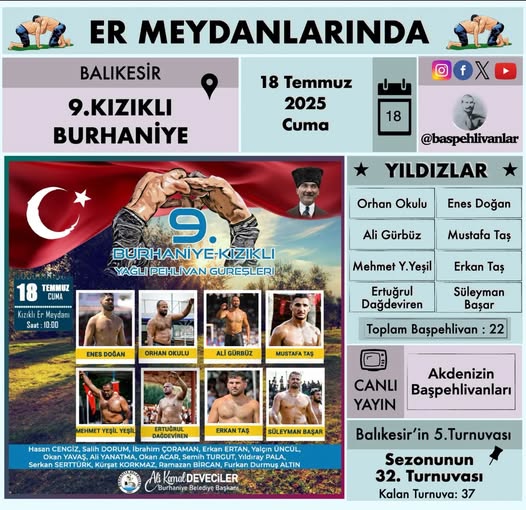 Sezonun 32. yağlı güreş organizasyonu olan 9. Burhaniye Kızıklı Yağlı Güreşleri, Balıkesir güreşseverlerini bir araya getirecek. Türkiye Geleneksel Güreşler Federasyonu (TGGF) kayıt sistemine göre, aralarında Orhan Okulu, Ali Gürbüz, Enes Doğan, Mehmet Yeşil Yeşil ve Mustafa Taş’ın da bulunduğu 22 başpehlivanın kol bağlaması bekleniyor.