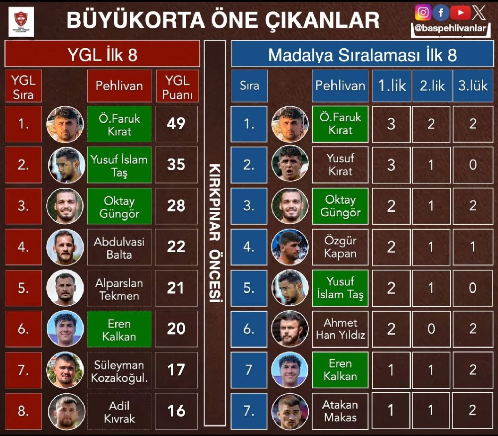 Yapılan analizler sonucunda bu iki listede de yer almayı başaran dört pehlivan, adeta bir adım öne çıktı. Bu güreşçiler, hem sezon boyunca istikrarlı başarı gösterdi, hem de farklı turnuvalarda madalyaları topladı.