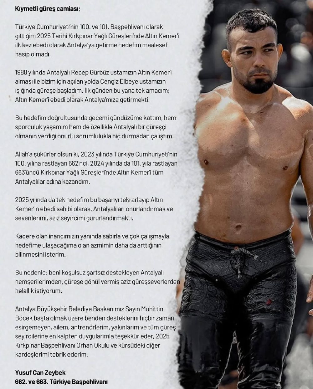664. Kırkpınar Yağlı Güreşleri’nde çeyrek finalde Ali İhsan Batmaz’a yenilerek altın kemerin ebedi sahibi olma şansını kaybeden Yusuf Can Zeybek, Kırkpınar sonrası duygusal bir açıklama yaptı: