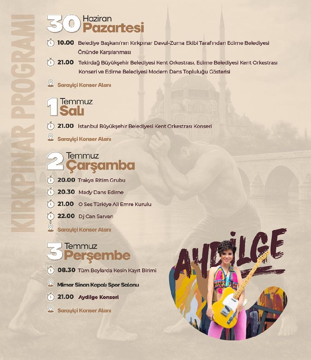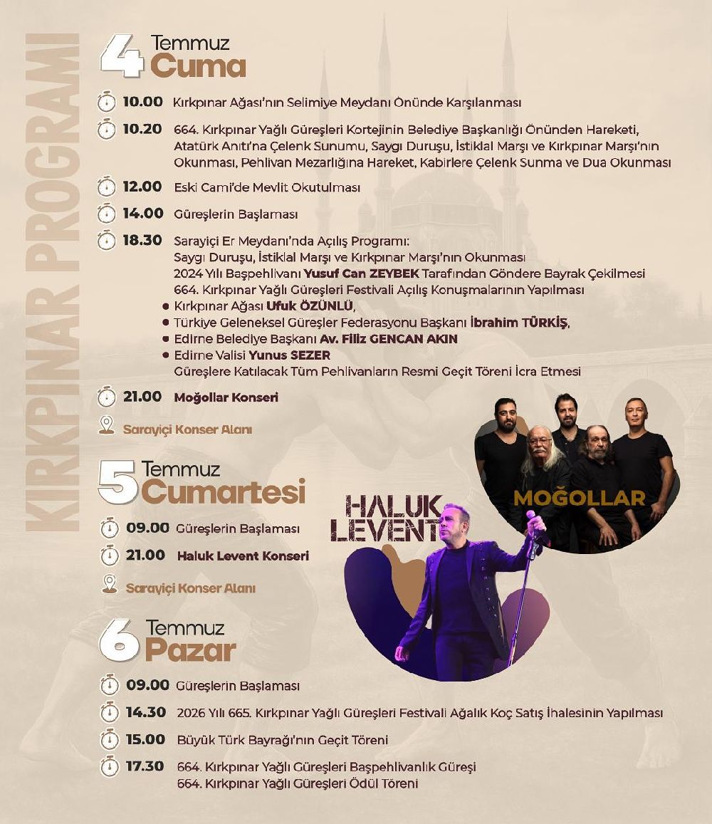 Edirne, bu yıl da hem ata sporumuz yağlı güreşin hem de müziğin coşkusunu bir arada yaşayacak. Edirne Belediyesi tarafından düzenlenen 664. Kırkpınar Yağlı Güreşleri Festivali, 30 Haziran – 6 Temmuz 2025 tarihleri arasında gerçekleştirilecek. Festival, sporla kültürü harmanlayan etkinlikleri ve sahne alacak sanatçılarıyla dikkat çekiyor.