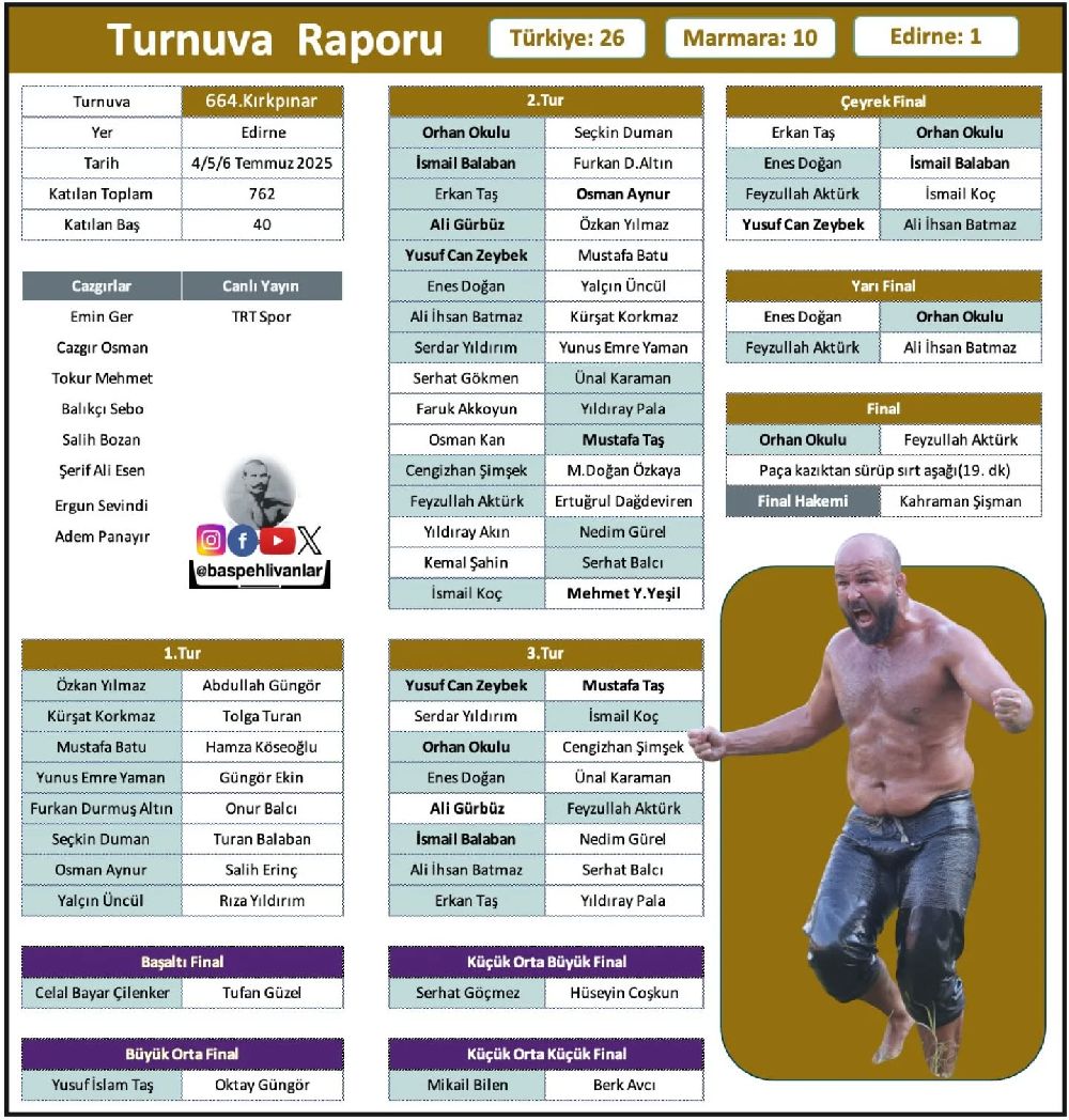 Tarihi ve kültürel kökleri yüzyıllar öncesine dayanan Kırkpınar Yağlı Güreşleri, 2025 yıl 664. kez Edirne Sarayiçi Er Meydanı’nda coşkuyla gerçekleştirildi. 4-5-6 Temmuz 2025 tarihlerinde düzenlenen organizasyon, hem sporcu katılımı hem de izleyici ilgisiyle bir kez daha Türk güreş tarihine damgasını vurdu.