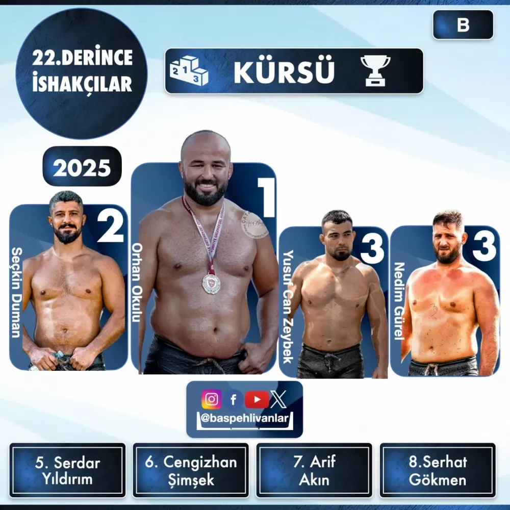 21 Eylül 2025 Pazar günü Kocaeli’nin Derince ilçesine bağlı Taşköprü İshakçılar’da gerçekleştirilen 22. Derince Taşköprü İshakçılar Yağlı Güreşleri'nde başpehlivanlık unvanını Orhan Okulu kazandı. Finalde Seçkin Duman’ı mağlup eden Orhan Okulu, bu yılki 10. başpehlivanlık zaferine ulaştı.