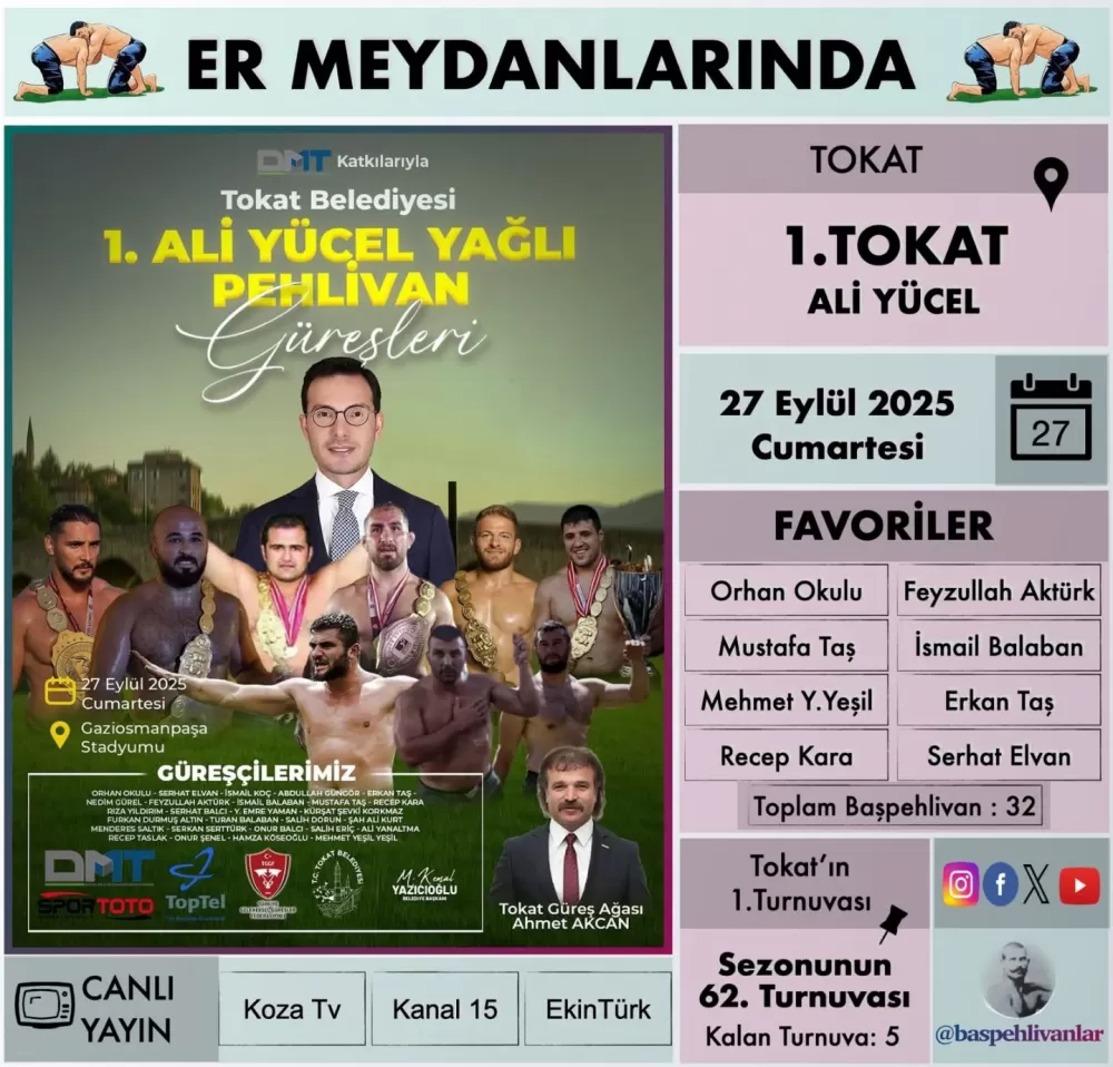 Yağlı güreş sezonunun 62. organizasyonu olan 1. Tokat Ali Yücel Yağlı Güreşleri, 27 Eylül 2025 Cumartesi günü Tokat’ta gerçekleştirilecek. Türkiye Geleneksel Güreşler Federasyonu'nun (TGGF) güncel takvimine göre sezonun tamamlanmasına 5 turnuva kalmışken, Tokat'taki bu ilk organizasyon, hem sporcular hem de güreşseverler için büyük önem taşıyor.