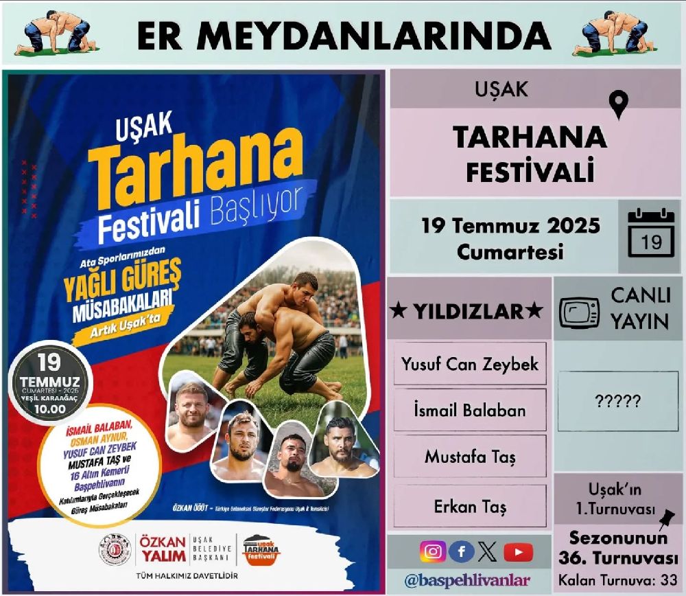 Uşak Belediyesi tarafından düzenlenen Tarhana Festivali kapsamında gerçekleştirilecek olan yağlı güreşler, 19 Temmuz 2025 Cumartesi günü yapılacak. Türkiye Geleneksel Güreşler Federasyonu (TGGF) takvimine göre sezonun 36. güreşi olan organizasyon, Uşak’ta güreşseverlerle buluşacak.