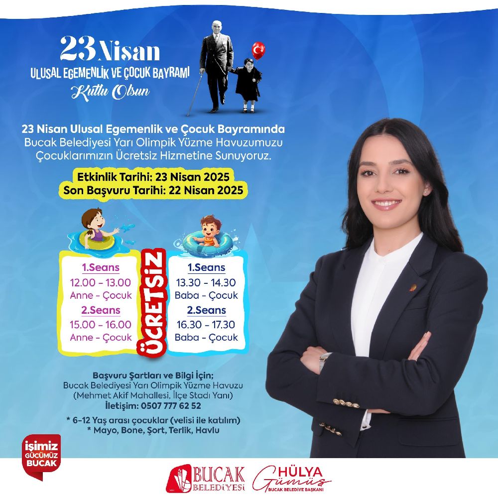 Burdur’un Bucak ilçesinde 23 Nisan Ulusal Egemenlik ve Çocuk Bayramı kapsamında çocuklara özel bir etkinlik düzenleniyor. Bucak Belediyesi, yarı olimpik yüzme havuzunu 6-12 yaş arası çocuklar için ücretsiz olarak hizmete açıyor.