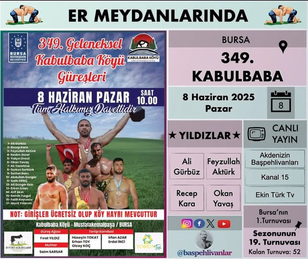 Sezonun 19. güreşi olma özelliğini taşıyan organizasyon, Bursa Büyükşehir Belediyesi ile Mustafakemalpaşa Kabulbaba Köyü Derneği’nin iş birliğinde gerçekleştirilecek. Güreşler, Kabulbaba Köyü Güreş Alanı’nda büyük bir katılımla yapılacak.
