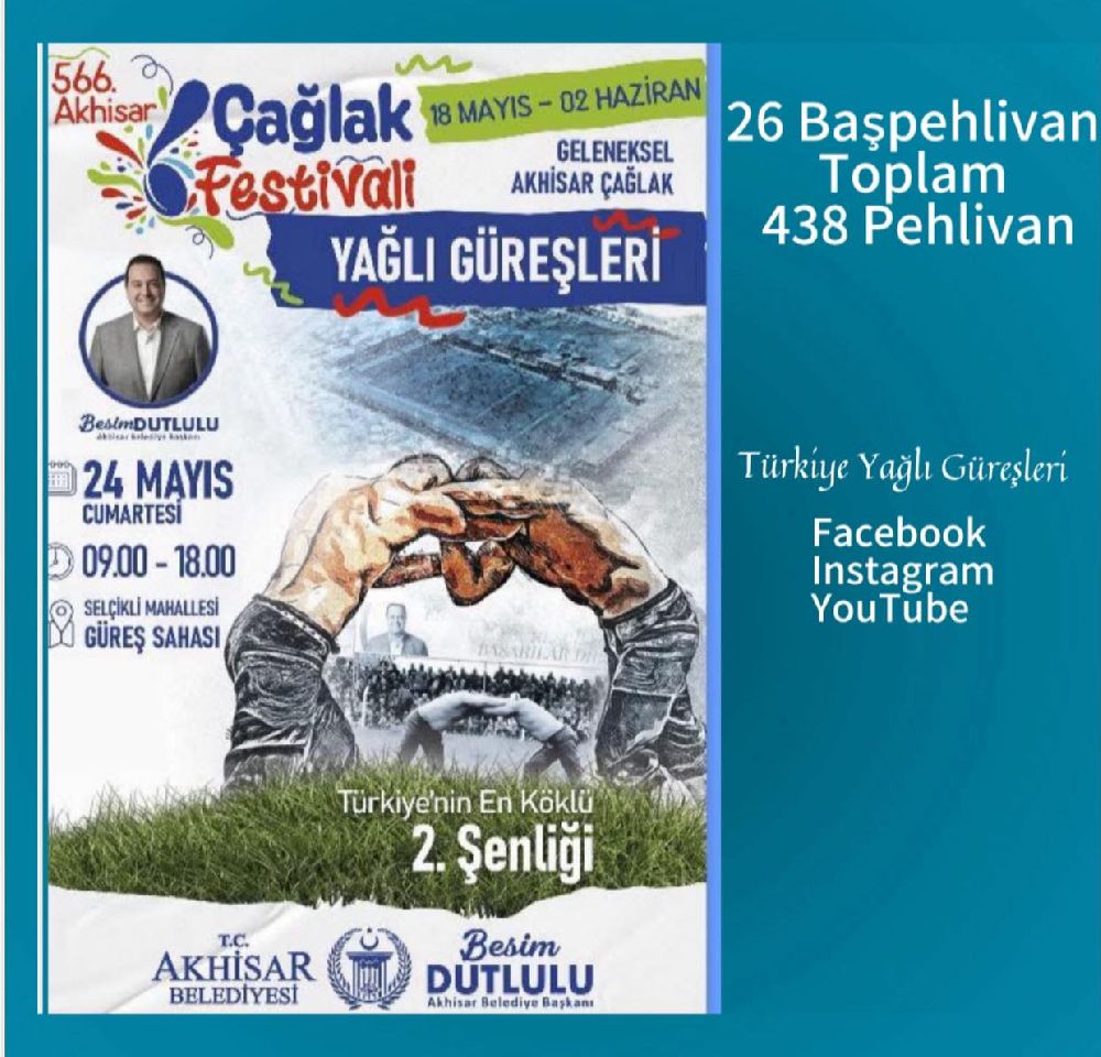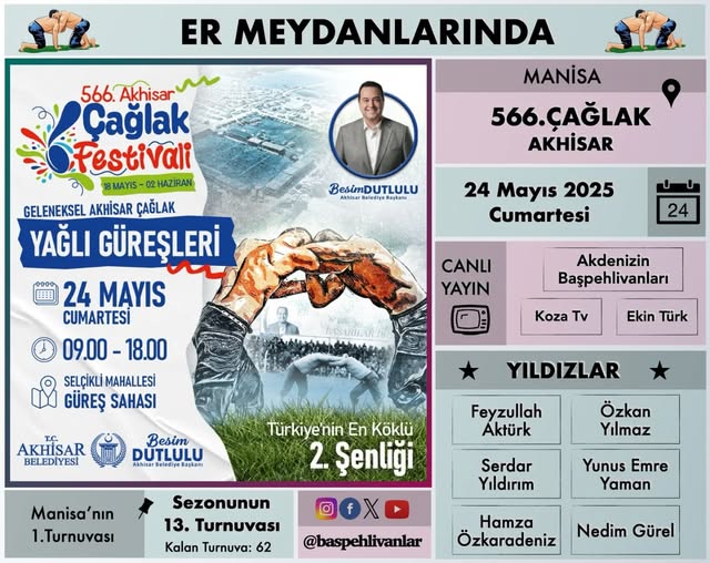 Ata sporumuzun en köklü ve görkemli organizasyonlarından biri olan 566. Akhisar Çağlak Yağlı Güreşleri, bu yıl da geleneğe yakışır şekilde 24 Mayıs 2025 Cumartesi günü Manisa’nın Akhisar ilçesinde, Selçikli Er Meydanı’nda gerçekleştirilecek.