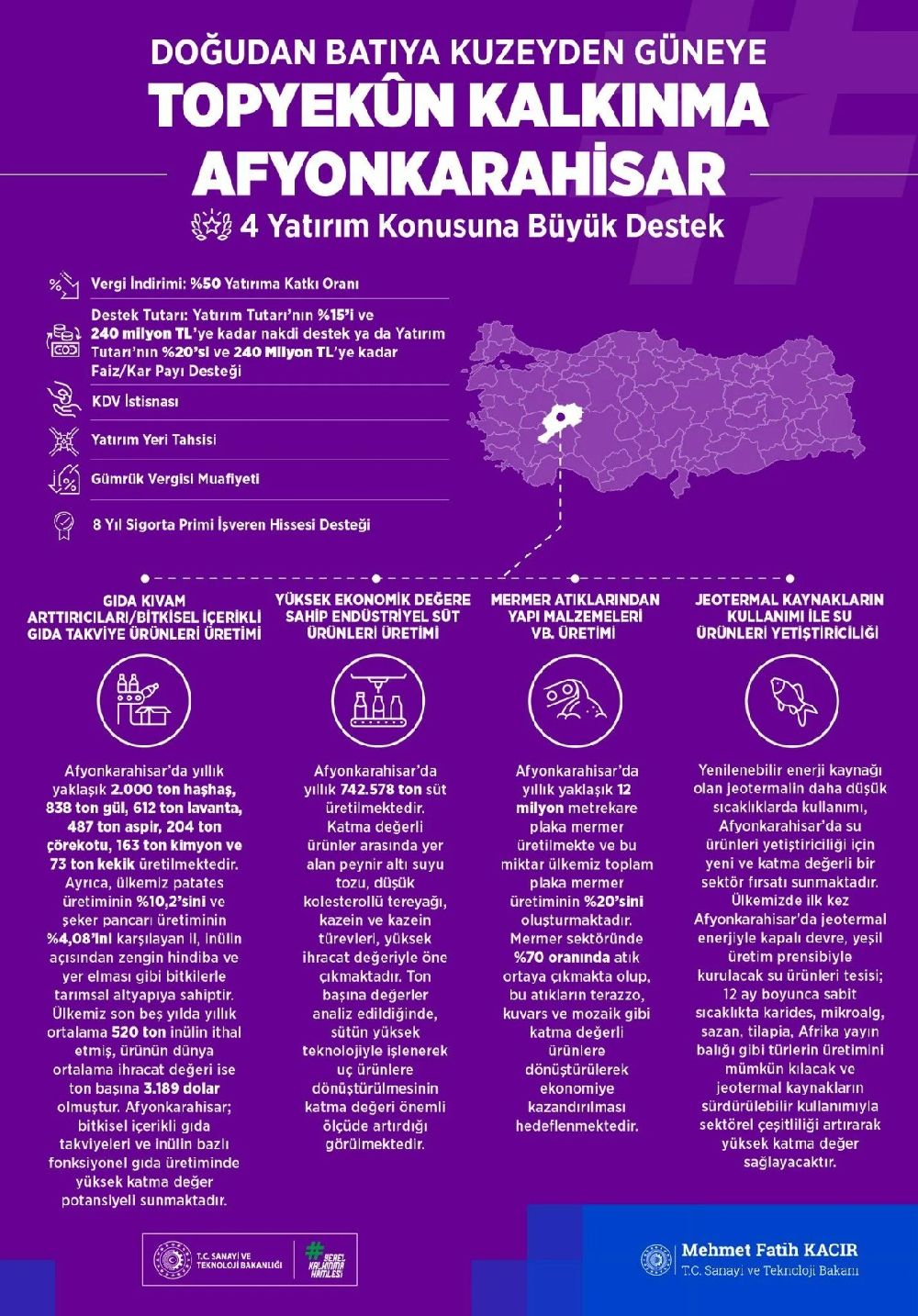 Sanayi ve Teknoloji Bakanlığı, Afyonkarahisar’ı stratejik yatırımlar için yeni bir merkez hâline getirmek amacıyla harekete geçti. Gıda teknolojilerinden çevreci üretimlere kadar dört ana sektöre yönelik teşvik paketiyle bölgesel kalkınma hedefleniyor.
