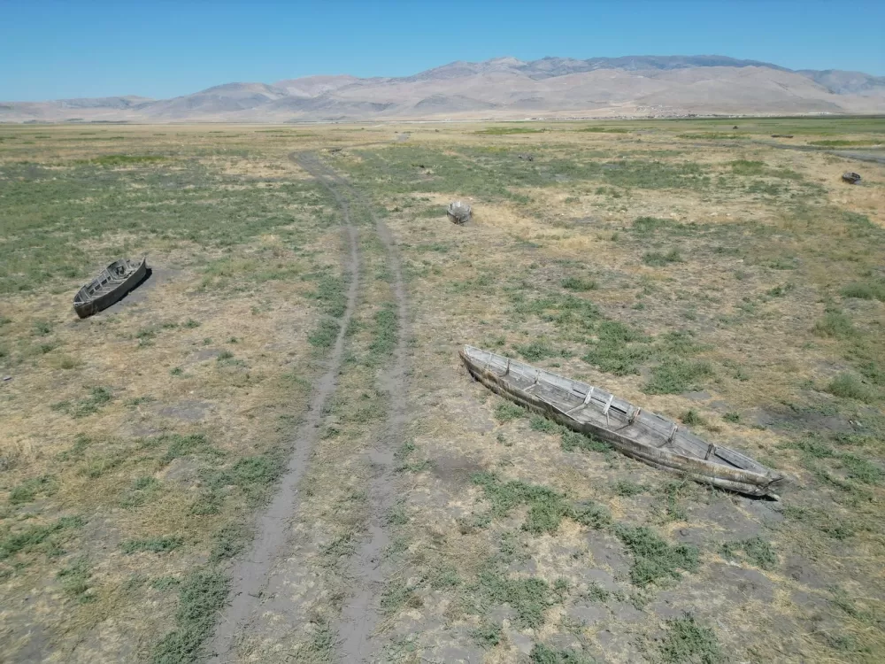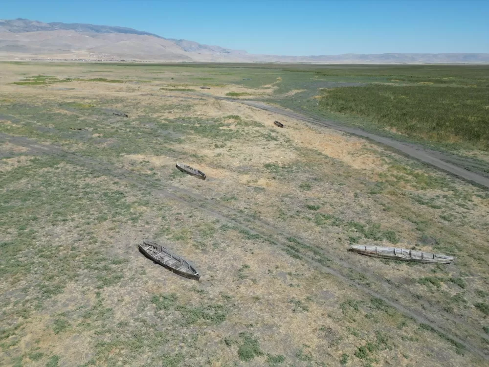 Gölde karaya oturan kayıklar korkutucu manzara oluşturdu