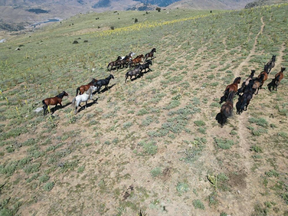 Afyonkarahisar'da ürkeklikleri ile bilinen yılkı atlarının dron ile havadan çekilen görüntüleri görenleri mest etti.