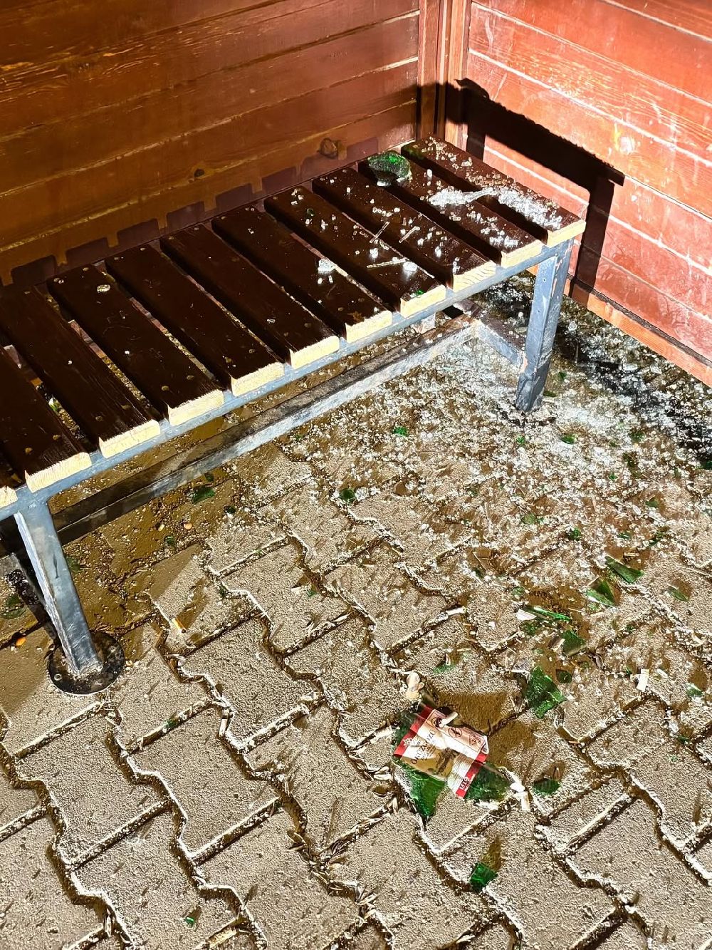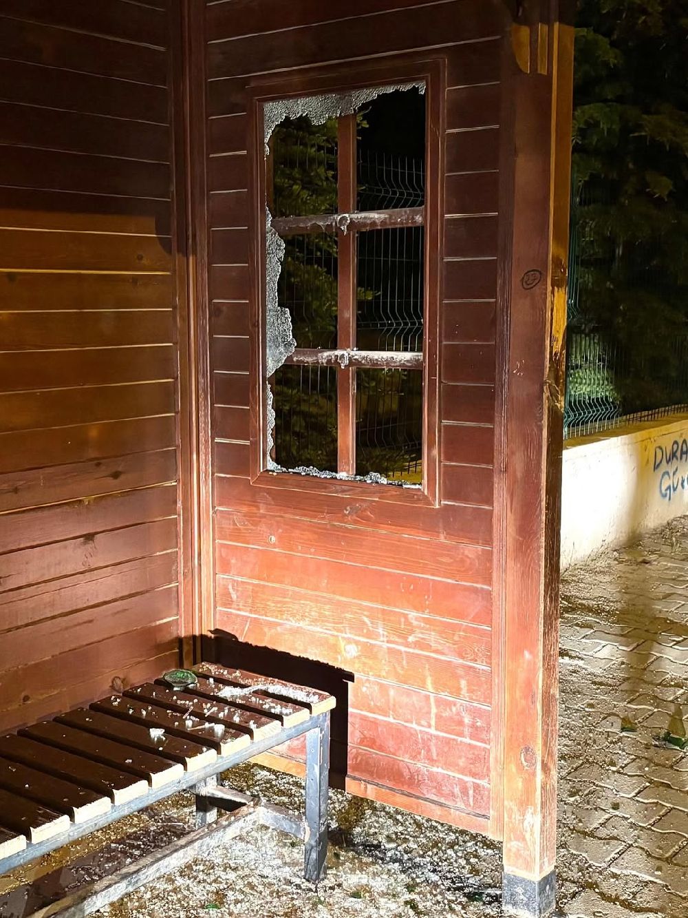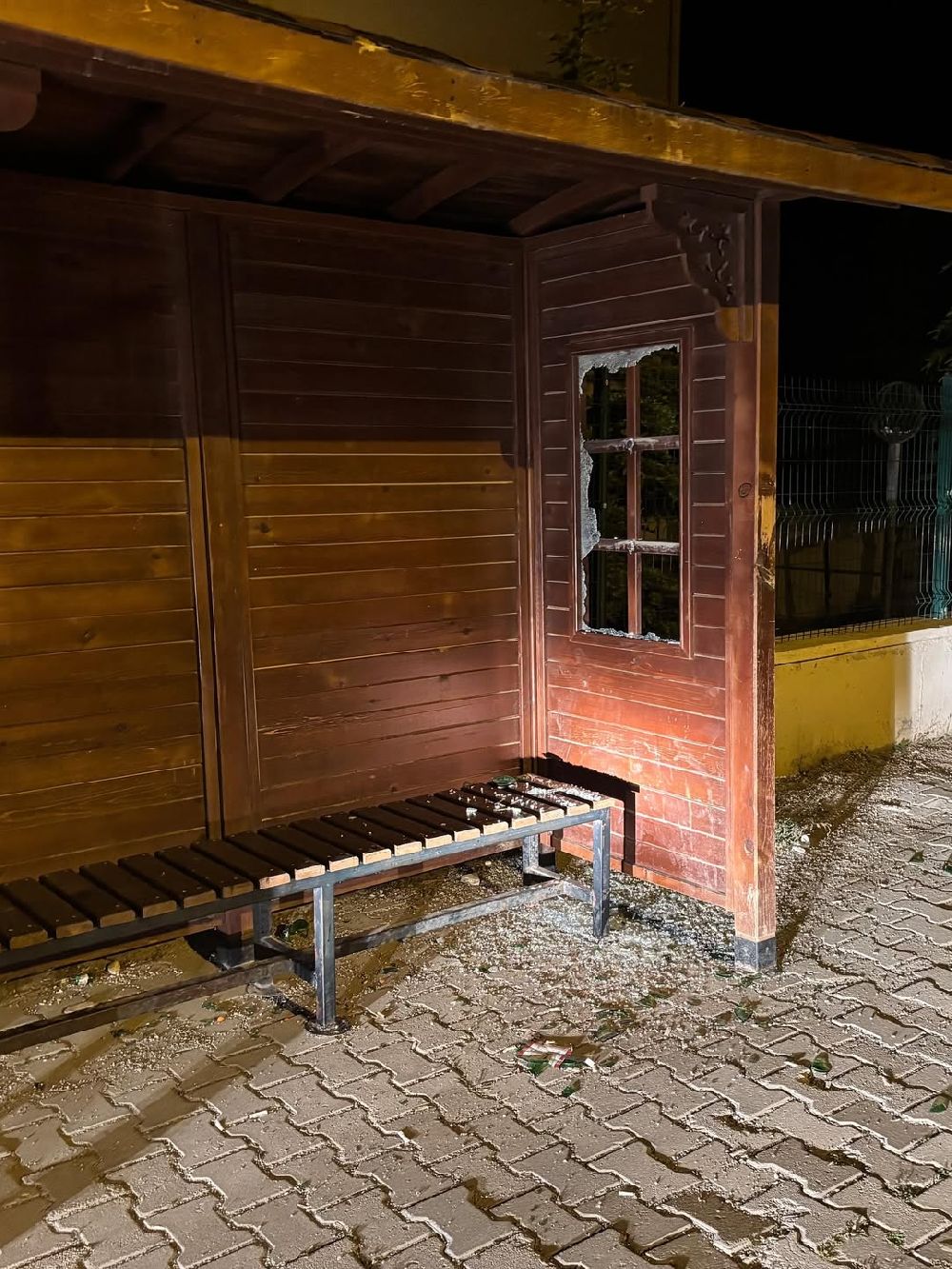 Okul önündeki otobüs durağında; hem şarap içip, hem de durağın camını kıran, kendini bilmezler,