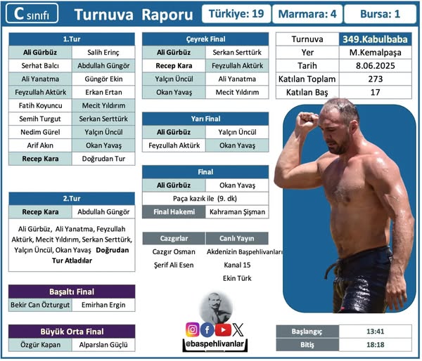 8 haziran 2025 pazar günü Saat 13:41'de cazgırların coşkulu salavatlarıyla başlayan başpehlivanlık güreşleri, yaklaşık 4 buçuk saat süren zorlu mücadelelerin ardından saat 18:18'de final müsabakasıyla doruk noktasına ulaştı. Güreşlerin atmosferini renklendiren Cazgır Osman ve Şerif Ali Esen, 5 tur boyunca başpehlivanları tek tek salavatlayarak seyircileri güreş heyecanına ortak ettiler.