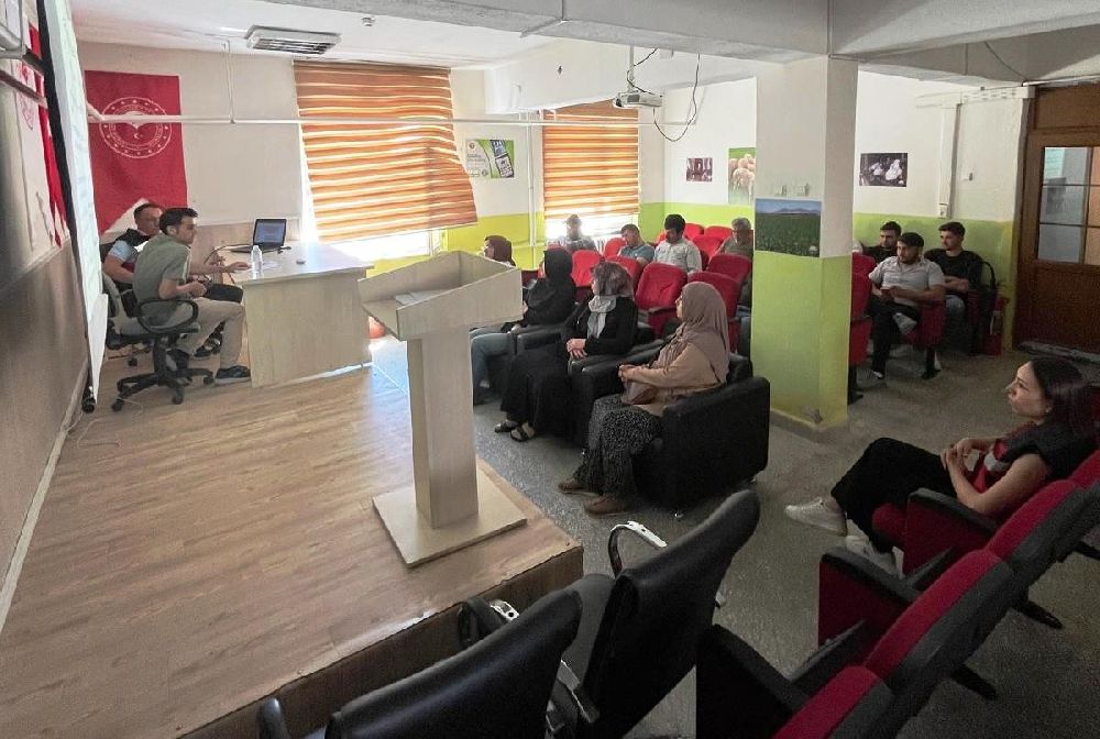 İlçe Tarım ve Orman Müdürlüğünde tarım ve hayvancılık sektörlerinin gelişmesi ve nitelikli üretici sayısının artırılması amacıyla açılan besi sığırı yetiştiriciliği kursunda kursiyerlere, İlçe Tarım Müdürü Yusuf Başan, Ziraat Mühendisi İsmail Ersen Atlı ve Veteriner Hekim Süleyman Mavi tarafından daha iyi, sürdürülebilir, bilinçli hayvancılık yapmalarını ve karşılaşmış oldukları sorunlarda nasıl yol izleyecekleri konularında bilgi veriliyor.