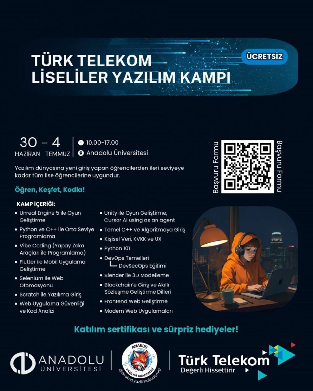 Tamamen ücretsiz olarak gerçekleştirilecek kamp, oyun geliştirmeden yapay zekâya, mobil uygulama tasarımından siber güvenliğe kadar birçok başlıkta uygulamalı eğitimler sunacak. 30 Haziran - 4 Temmuz 2025 tarihleri arasında Anadolu Üniversitesi İktisadi ve İdari Bilimler Fakültesinde gerçekleştirilecek kamp kapsamında öğrenciler; Unreal Engine 5, Python, C++, Unity, Blender, Flutter, DevOps ve Vibe Coding gibi güncel yazılım araçlarıyla tanışacak. Eğitimler, alanında uzman eğitmenler tarafından yürütülecek. Kamp sonunda tüm katılımcılara katılım belgesi verilecek; ayrıca çeşitli sürpriz hediyeler de gençleri bekliyor. "Öğren, Keşfet, Kodla!" mottosuyla hayata geçirilen program, gençlerin teknolojiye yalnızca tüketici olarak değil, üretici olarak yaklaşmalarını teşvik etmeyi amaçlıyor.