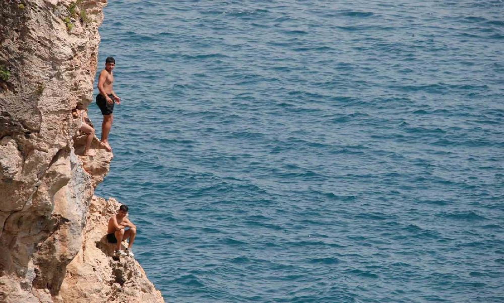 Antalya’nın dünyaca ünlü Konyaaltı Sahili’nde havaların ısınması ile birlikte özellikle hafta sonları yoğunluk yaşanıyor. Konyaaltı Sahili’nden yaklaşık 30 metrelik falezler manzarasıyla görenleri büyülerken adrenalin tutkunu gençlerin tehlikeli eğlencesine de sahne oluyor. Yaklaşık 30 metre yüksekliğindeki falezlerden denize atlayan gençler görenleri hem hayrete düşürüyor hem de yüreklerini ağzına getiriyor. Geçmiş yıllarda yaşanan ve ölüme varan ciddi sonuçlara neden olan olaylardan ders çıkarmayan bazı gençler şov ve adrenalin uğruna bu atlayışlarını sürdürüyor.