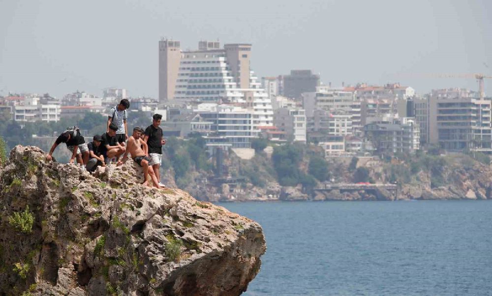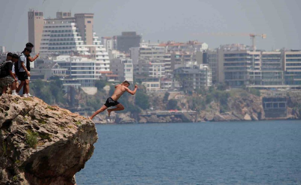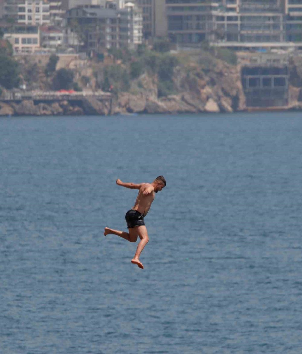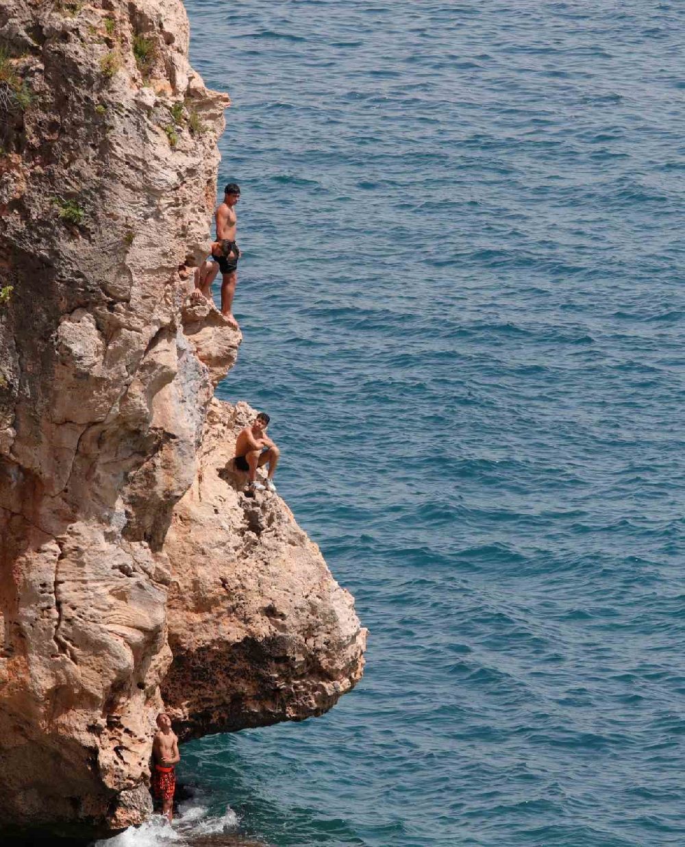 Antalya’nın Konyaaltı Sahili’nde adrenalin tutkunu gençlerin 30 metre yüksekliğindeki falezlerden denize yaptıkları tehlikeli atlayış izleyenlerin yüreklerini ağzına getirdi.