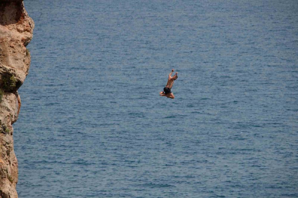Bazı gençler denize yakın 5 metrelik kayalık alandan kendilerini boşluğa bırakırken, bir genç ise sahilde denize giren vatandaşların şaşkın bakışları arasında falezlerin yaklaşık 30 metrelik zirve noktasına çıktı. Burada bir süre bekleyen genç ardından canını hiçe sayarak kendini boşluğa bıraktı. Sahilde güneşlenen ve denize giren vatandaşların hayretler içerisindeki bakışları arasında gencin 30 metre yükseklikten kendini sulara bıraktığı anlar ise kameralara yansıdı.