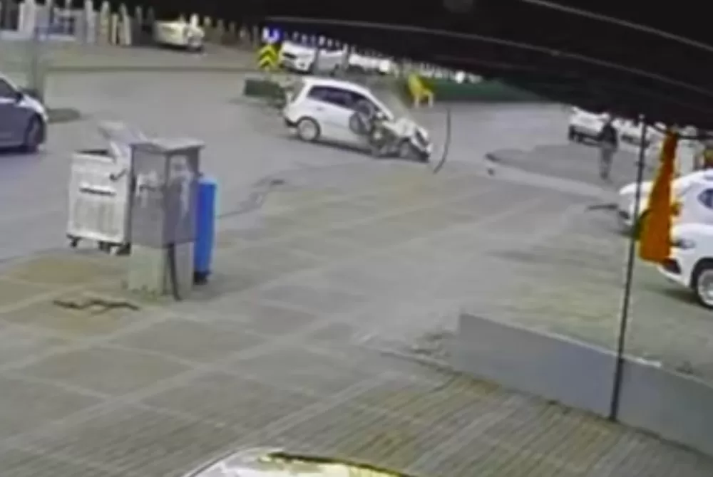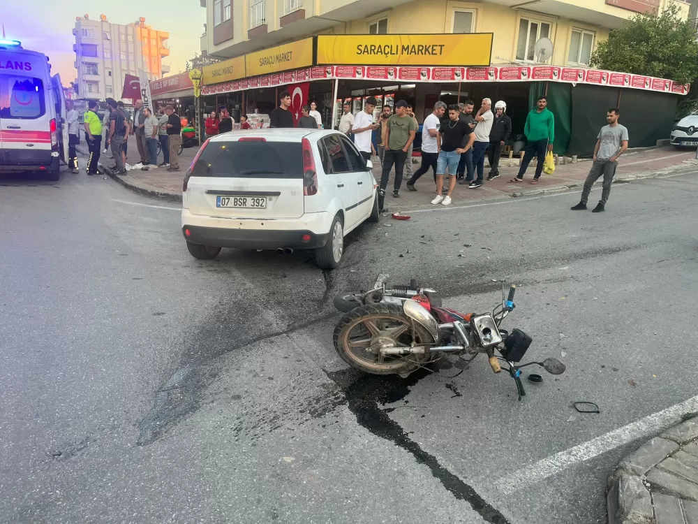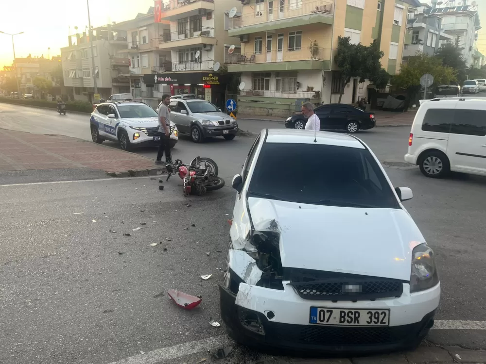 Antalya'nın Manavgat ilçesinde motosiklet ile otomobilin kavşakta çarpışması sonucu meydana gelen kazada yabancı uyruklu motosiklet sürücüsü yaralanırken, motosikletin plakasız ve sürücünün ise ehliyetsiz olduğu, kaskının da bulunmadığı belirlendi. Sürücünün çarpışmanın etkisiyle takla atıp otomobilin diğer tarafına düştüğü anlar güvenlik kamerasına yansıdı.