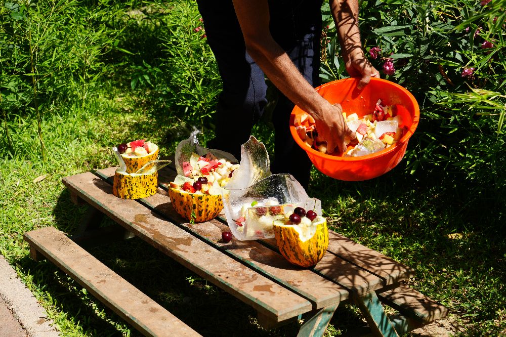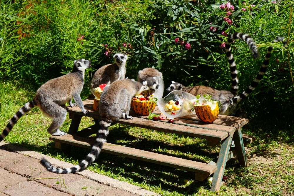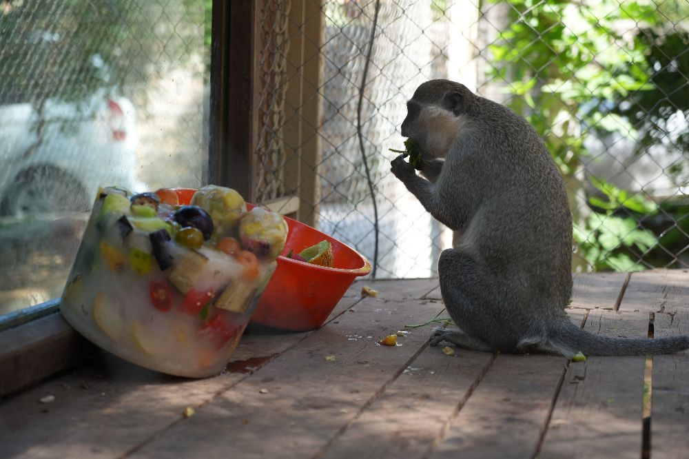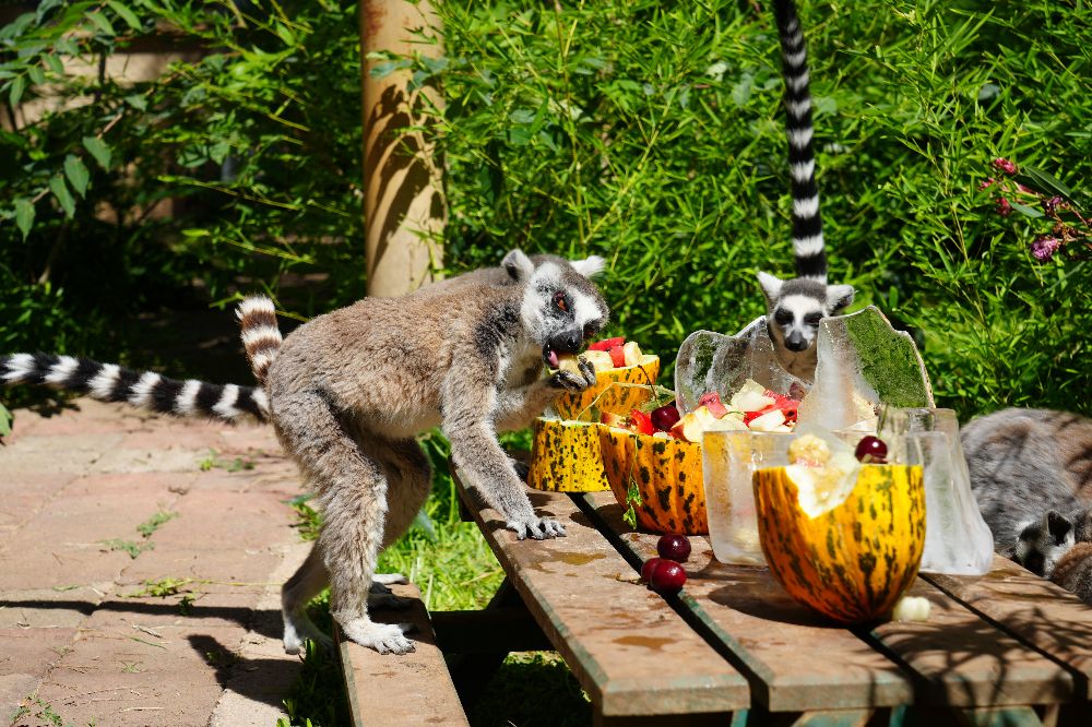 Park çalışanları, sıcaklardan etkilenen hayvanlar için buz kalıpları içerisinde meyve ve sebzelerden oluşan karışımlar hazırlıyor. Bozayı, lemur ve maymunlar, karpuz, muz, elma, portakal ve kiraz gibi meyvelerden oluşan buzlu kokteyli keyifle tüketirken bu anlar ziyaretçilerin de ilgisini çekiyor.