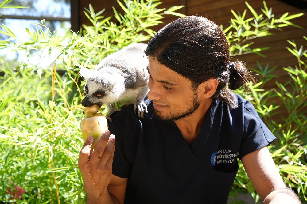 Antalya Doğal Yaşam Parkı'ndaki bin 600 hayvan, bunaltıcı sıcaklarda buzlu meyve kokteyli, fıskiyelerle serinletiliyor. Antalya Doğal Yaşam Parkı Şube Müdürü Veteriner Hekim Aygül Arsun, "Lemurdan ayıya birçok tür için özel önlemler alıyoruz" dedi.
