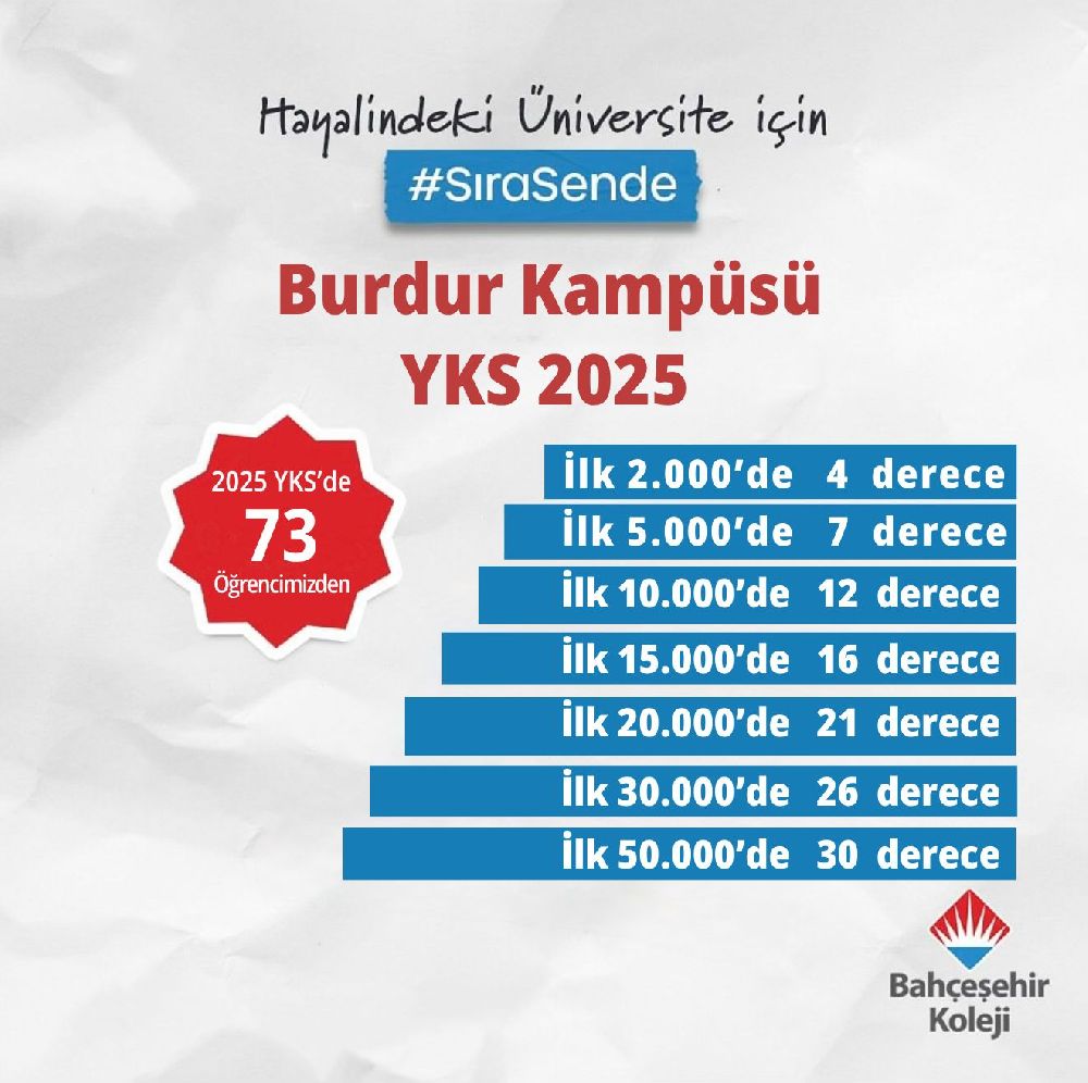 2025 Yükseköğretim Kurumları Sınavı (YKS) sonuçlarına göre Bahçeşehir Koleji Burdur Kampüsü, elde ettiği derecelerle hem Burdur’un hem de bölgenin eğitimdeki yükselen yıldızı olduğunu bir kez daha kanıtladı.