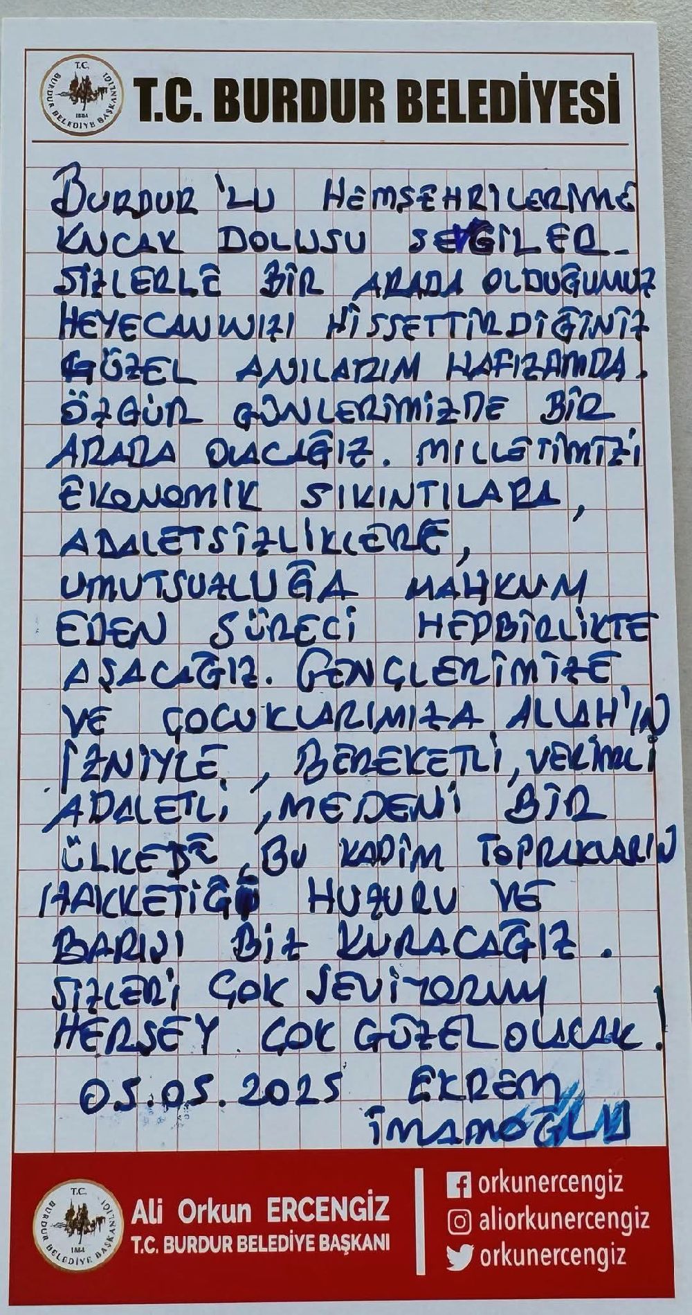 Ekrem İmamoğlu yazılı açıklamasında, " Burdurlu hemşerilerimi kucak dolusu sevgiler sizlerle bir arada olduğumuz heyacanınızı hissettirdiğiniz güzel anılarım hafızamda Özgür günlerimize bir arada olacağız milletimizi ekonomik sıkıntılara adaletsizliklere umutsuzluğa mahkum eden süreci hep birlikte aşacağız gençlerimize ve çocuklarımıza Allah’ın izniyle bereketli verimli adaletli medeni bir ülkede bu kadim toprakların hakettiği huzuru ve barışı biz kuracağız sizleri çok seviyorum her şey çok güzel olacak" ifadelerini kullandı.