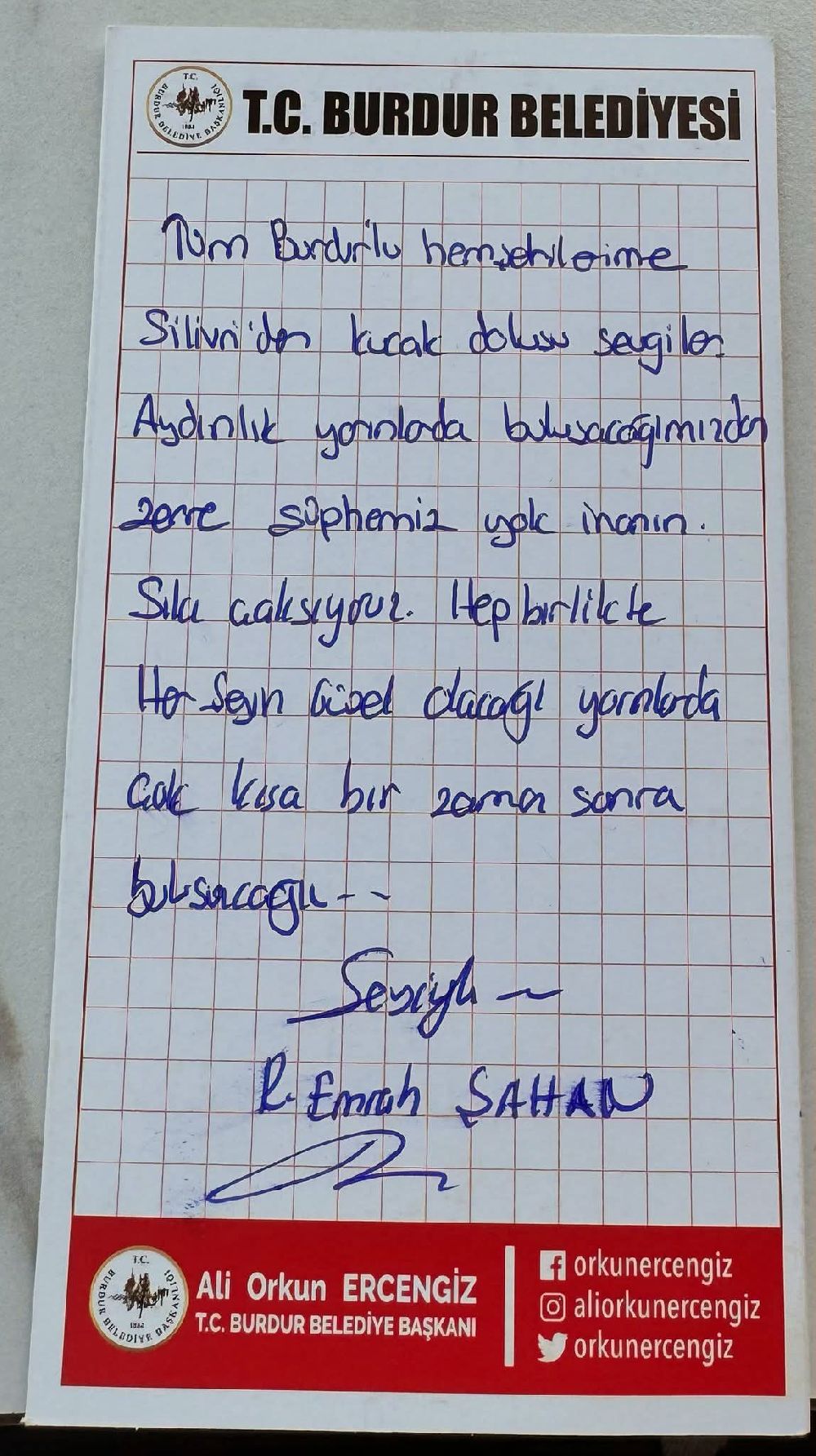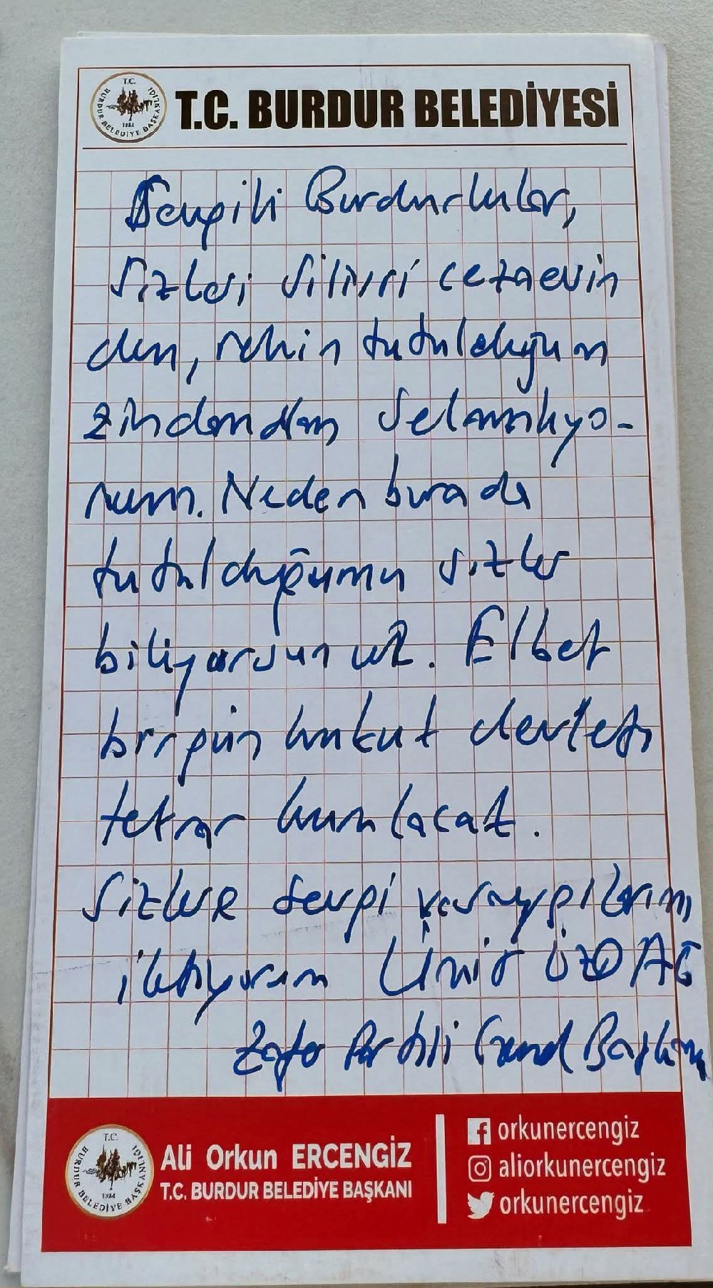 R. Emrah Şahan ise yazılı notunda, " Tüm Burdurlu hemşerilerime Silivri’den kucak dolusu sevgiler aydınlık yarınlarda buluşacağımızdan zerre şüphemiz yok inanın sıkı çalışıyoruz hep birlikte her şeyin güzel olacağı yarınlarda çok kısa bir zaman sonra buluşacağız sevgiyle " sözlerine yer verdi.