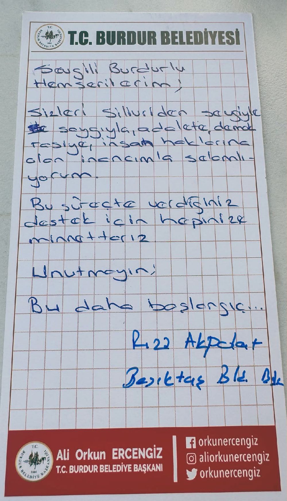 Beşiktaş Beldiye Başkanı Rıza Akpolat yazılı mesajında, " Sevgili Burdurlu hemşerilerim sizleri Silivri’den sevgiyle ve saygıyla adalete demokrasiye insan haklarına olan inancımla selamlıyorum Bu süreçte verdiğiniz destek için hepinize minnettarız unutmayın Bu da başlangıç " sözlerine yer verdi.