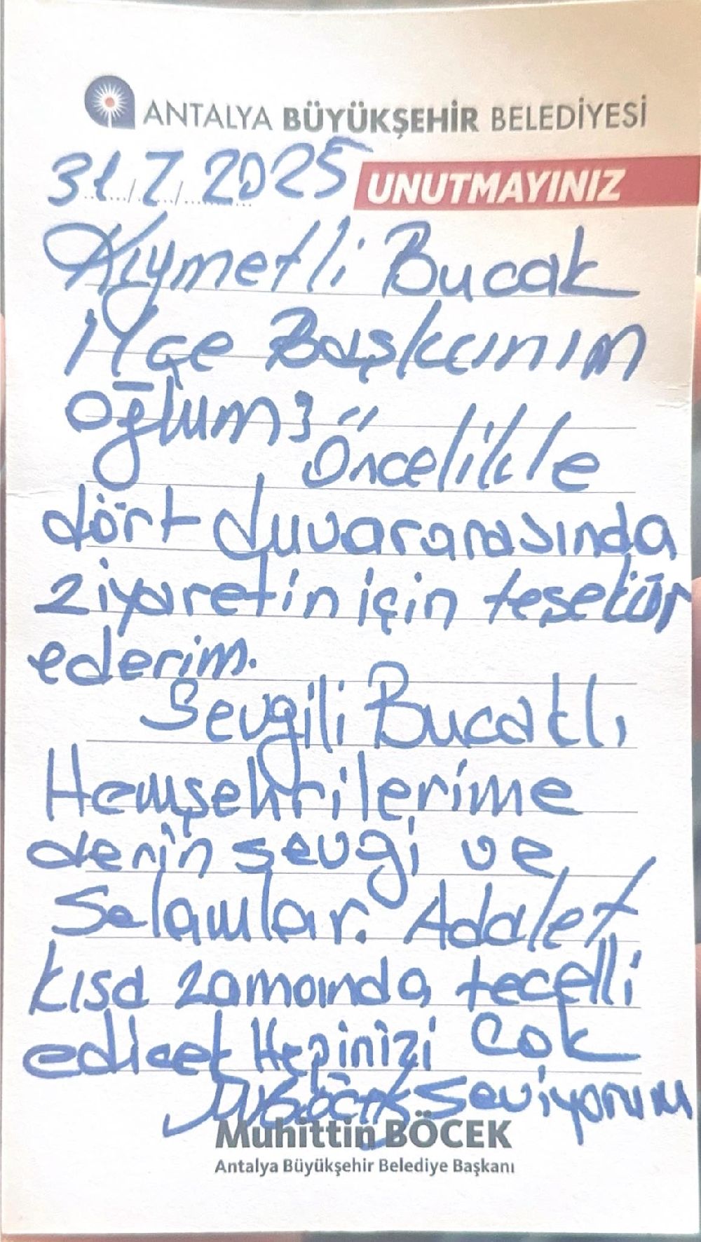 CHP Bucak İlçe Başkanı Av. Ahmet Sedat Oktay yaptığı açıklamada, " Antalya Yüksek Güvenlikli Cezaevi’nde değerli Antalya Büyükşehir Belediye Başkanımız Muhittin Böcek’i ziyaret ettim.