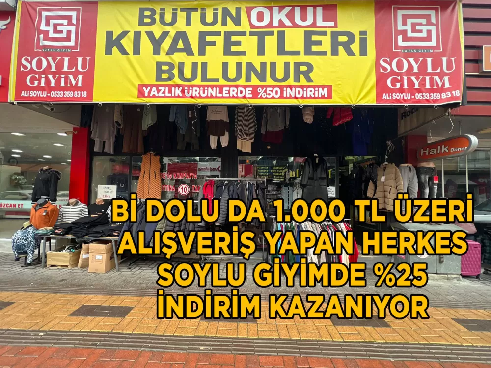 Kampanya kampanyasında Bi Dolu AVM’den 1000 TL ve üzeri alışveriş yapan herkes, anında SOYLU GİYİM ALİ SOYLU mağazasında %25 indirim kazanıyor.