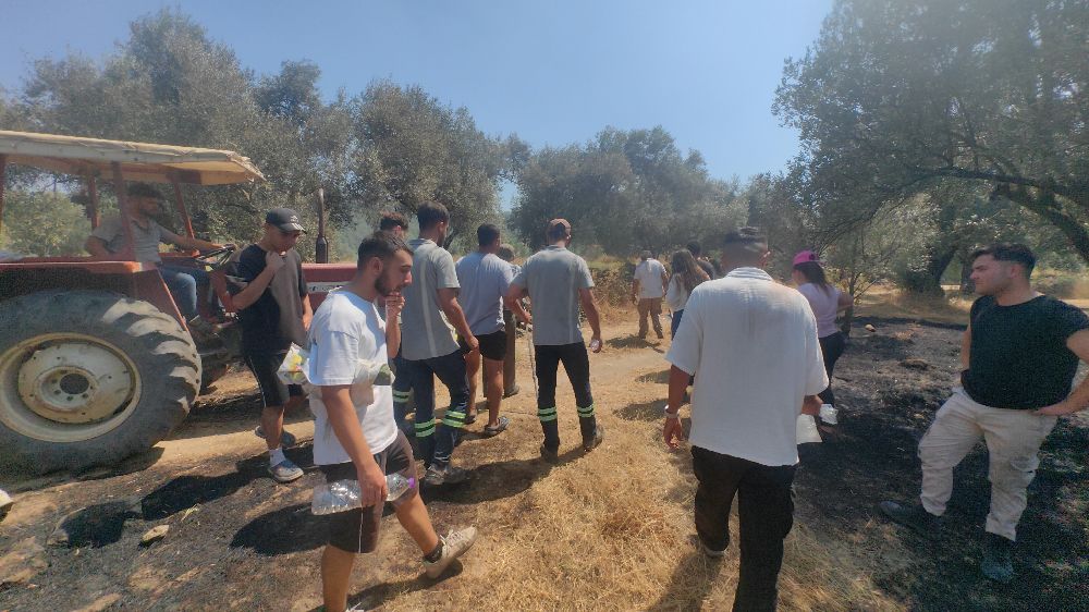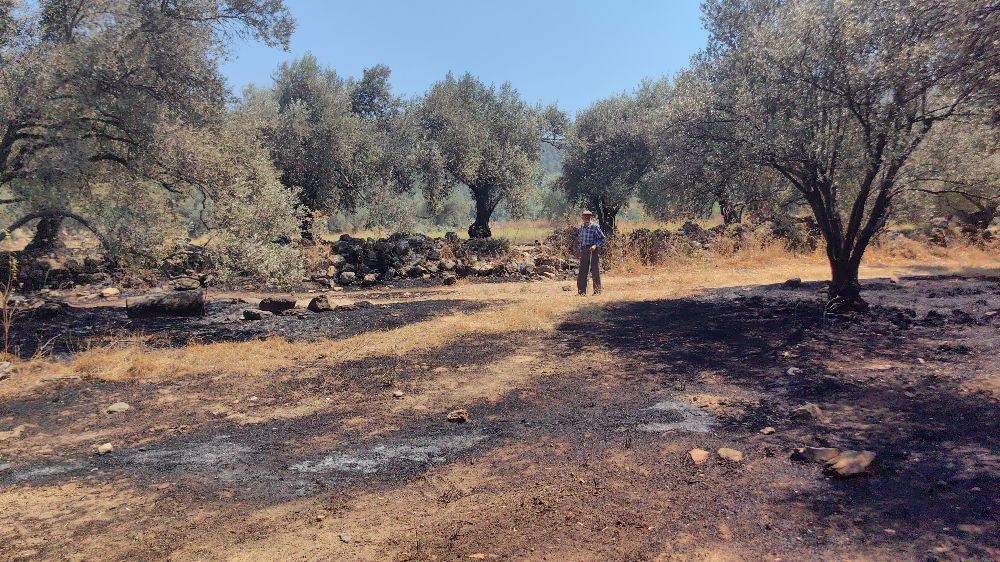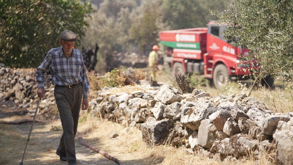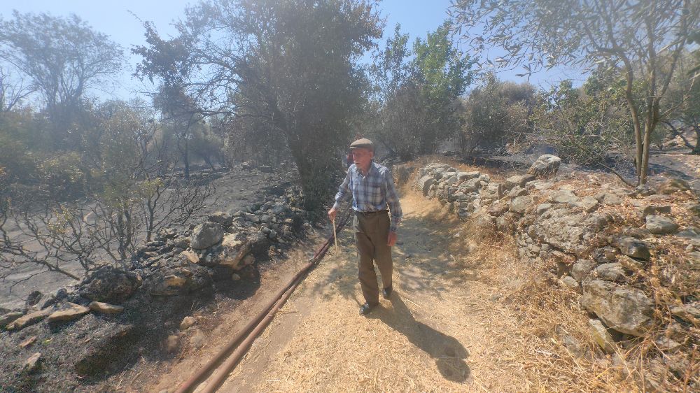 Muğla’nın Yatağan ilçesindeki Stratonikia Antik Kenti içinde etkili olan zirai alan yangını ekiplerin müdahalesi ile kontrol altına alınırken, antik kent sınırları içerisindeki evinde yaşamını sürdüren 94 yaşındaki Durmuş Tandır, bahçelerine bakmak için geldiği yangın yerinden görevliler tarafından zar zor ikna edilerek uzaklaştırıldı.