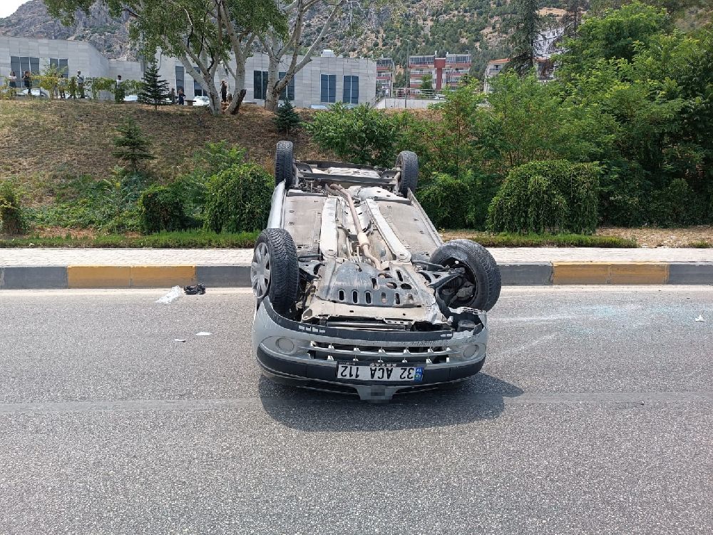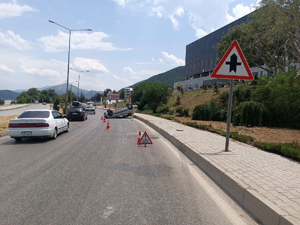 Isparta'nın Eğirdir ilçesinde, sürücüsünün virajda direksiyon hakimiyetini kaybetmesi sonucu bordür taşına çarpan otomobil takla attı. Kazada sürücü yaralandı.