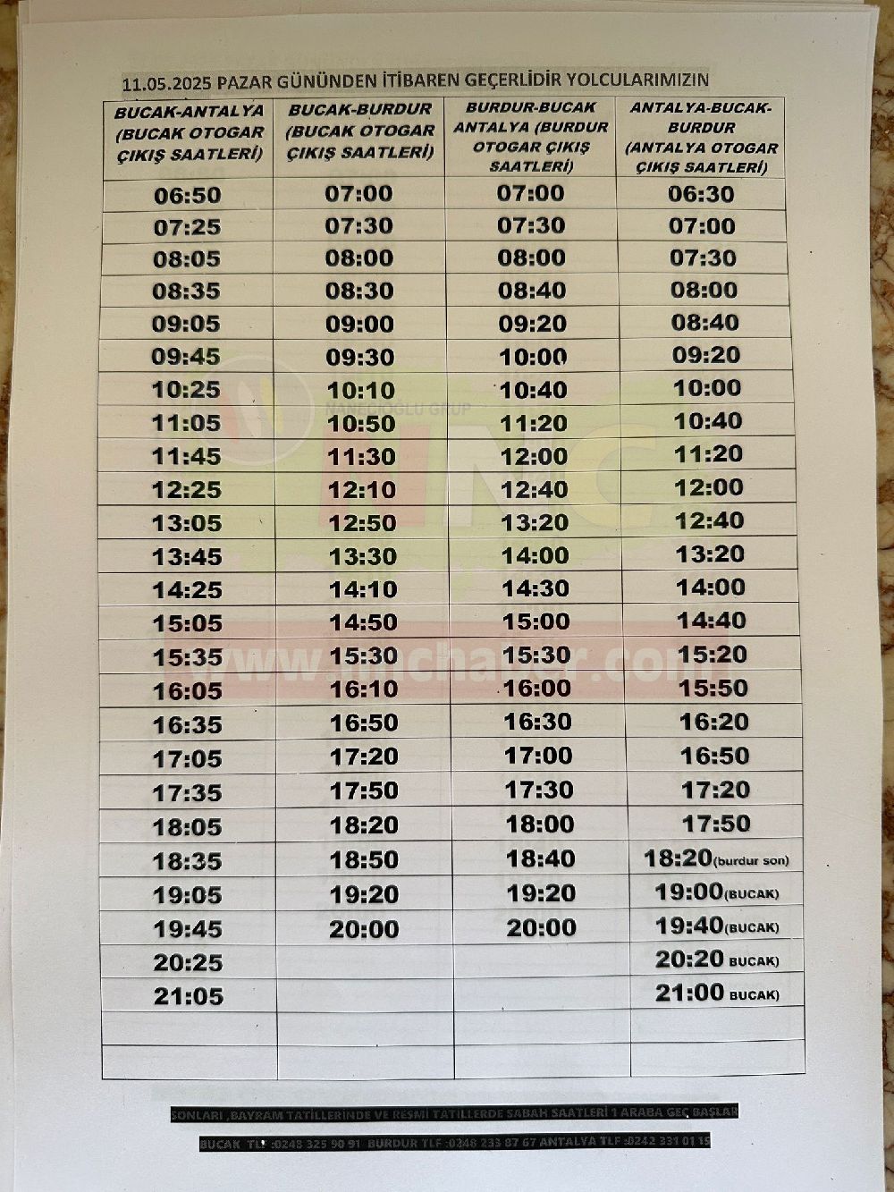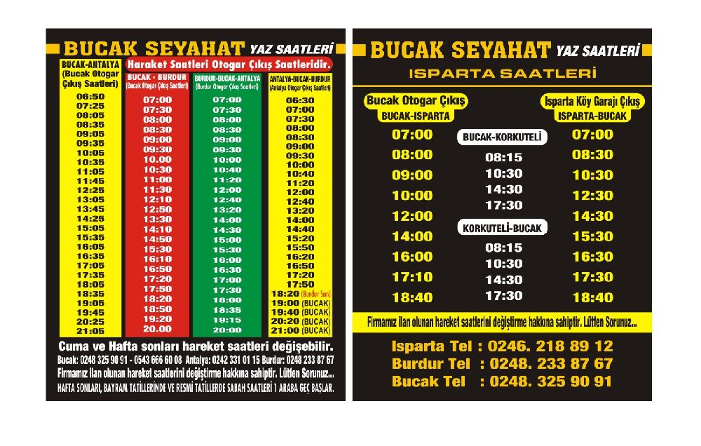Bucak Seyahat, 11 Mayıs tarihinden (bugün) itibaren geçerli olan yaz saati sefer saatleri belli oldu. İşte Bucak Seyahat'in sefer saatleri;
