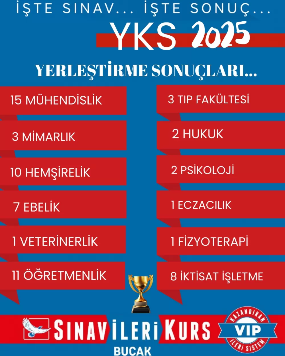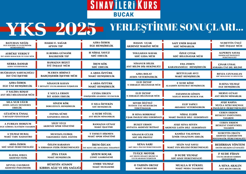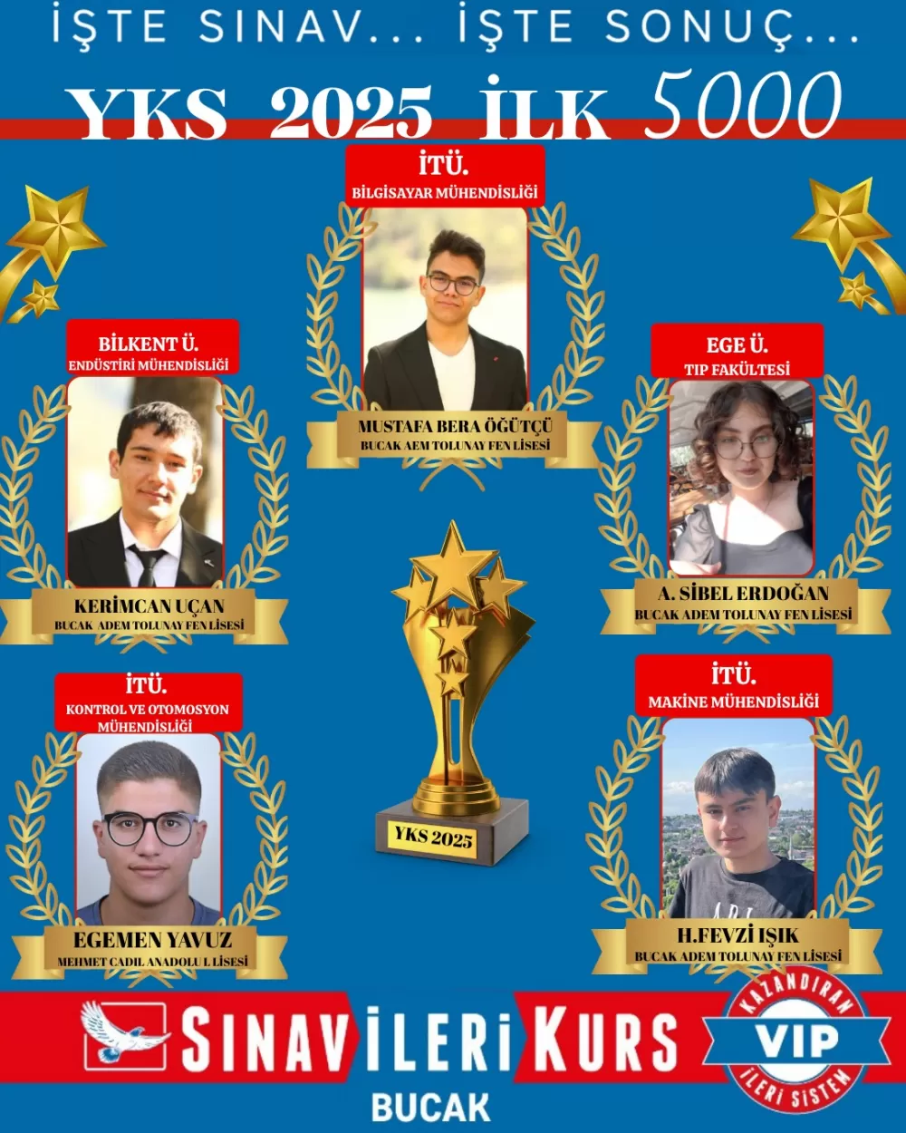2024-2025 eğitim öğretim yılı sonunda yapılan YKS sonuçlarına göre Bucak Sınav İleri Kurs öğrencileri aldıkları puanlar doğrultusunda Türkiye'nin en değerli üniversitelerine ve bölümlerine yerleştiler. YKS puanına göre AYT Türkiye 1.'si ve YKS Türkiye 19.'su çıkaran Bucak Sınav İleri Kurs sadece Türkiye derecesi yapmakla kalmayıp birçok öğrencisini de iyi derecede okullara yerleştirmeyi başardı.