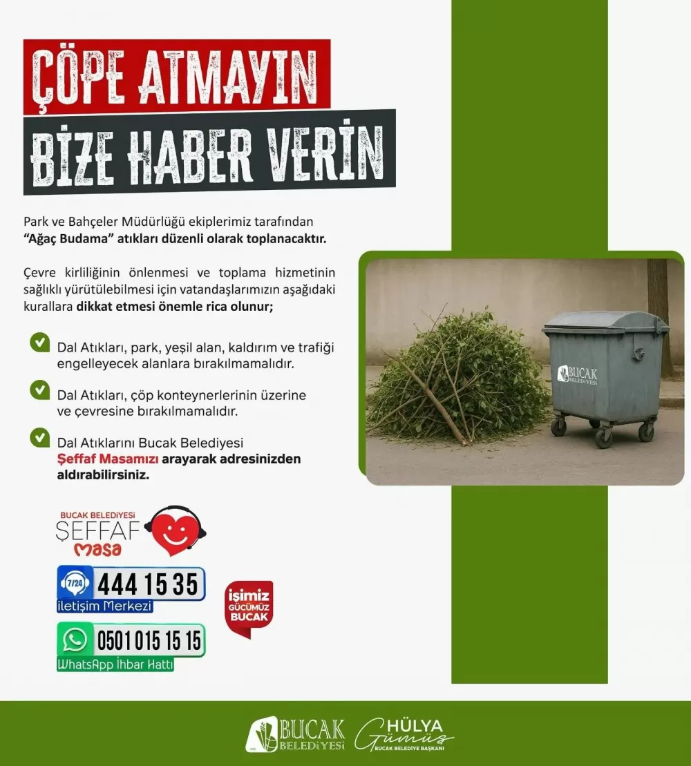 Yetkililer, budama atıklarının parklara, yeşil alanlara, kaldırımlara ve yol kenarlarına bırakılmaması gerektiğini belirtti. Özellikle çöp konteynerlerinin üstüne veya çevresine bırakılan atıkların, kötü görüntü ve çevre kirliliğine neden olduğu ifade edildi. Bucak Belediyesi, düzenli toplama planı sayesinde atıkların zamanında ve verimli bir şekilde alınacağını açıkladı.
