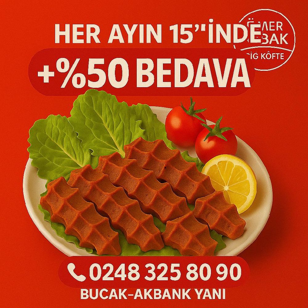 Bucak'ta açılan ilk çiğ köfte işletmelerinden olan Ömer Aybak Çiğ Köfte işletme sahibi Enes Can kara, sizlere verdiği kaliteli hizmetle her ayın 15'i için kampanya sunuyor.