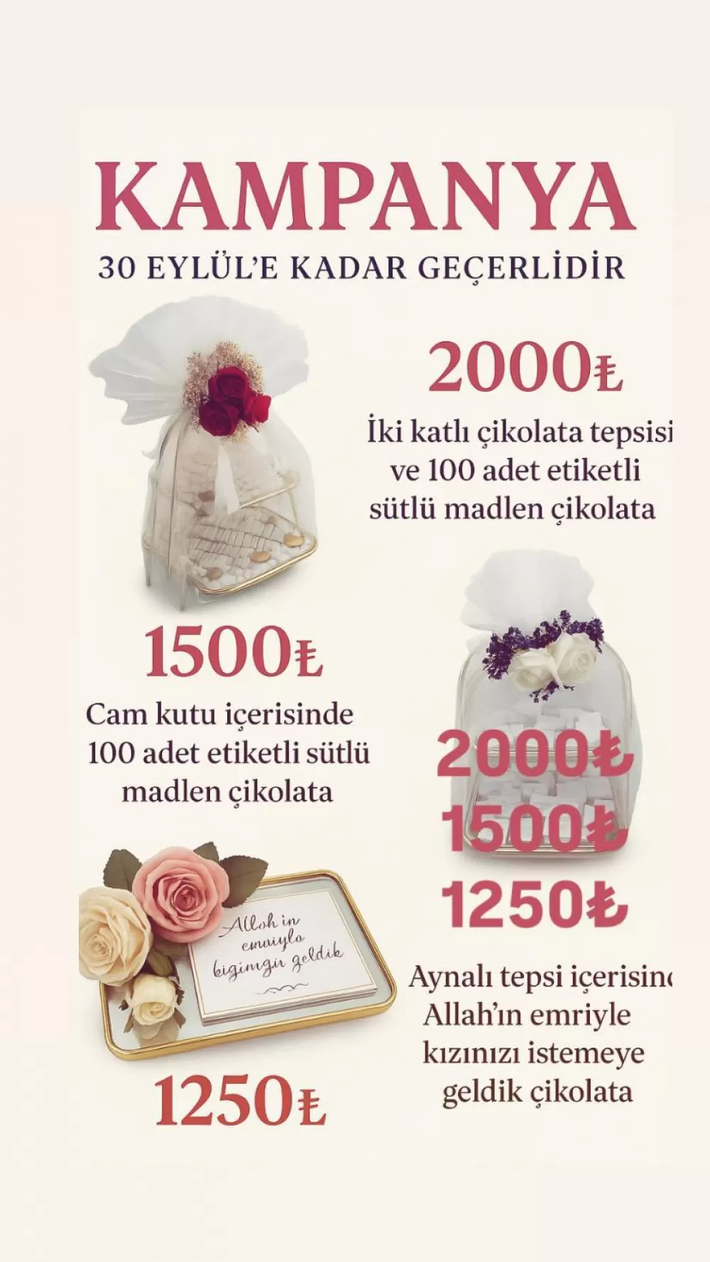 Kampanya kapsamında, iki katlı çikolata tepsisi ve 100 adet etiketli sütlü madlen çikolata 2000 TL, cam kutu içerisinde 100 adet etiketli sütlü madlen çikolata 1500 TL, aynalı tepside “Allah’ın emriyle kızınızı istemeye geldik” yazılı çikolata ise 1250 TL’den satışa sunuluyor. Tüm ürünlerde özel tasarım detayları ve kaliteli çikolata kullanımı öne çıkıyor.