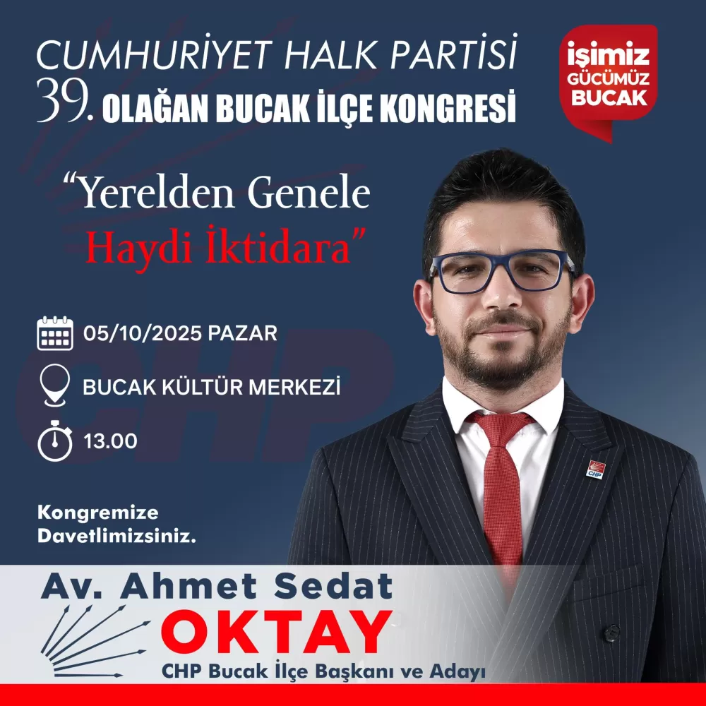 Cumhuriyet Halk Partisi (CHP) Bucak İlçe Başkanı ve Başkan Adayı Av. Ahmet Sedat Oktay, yaklaşan 39. Olağan Kongre öncesinde kamuoyuna önemli mesajlar verdi. Partinin köklü mücadelesine vurgu yapan Oktay, “Bucak’ta tarih yazan ilçe örgütümüzle yeni bir döneme başlıyoruz” ifadelerini kullandı.