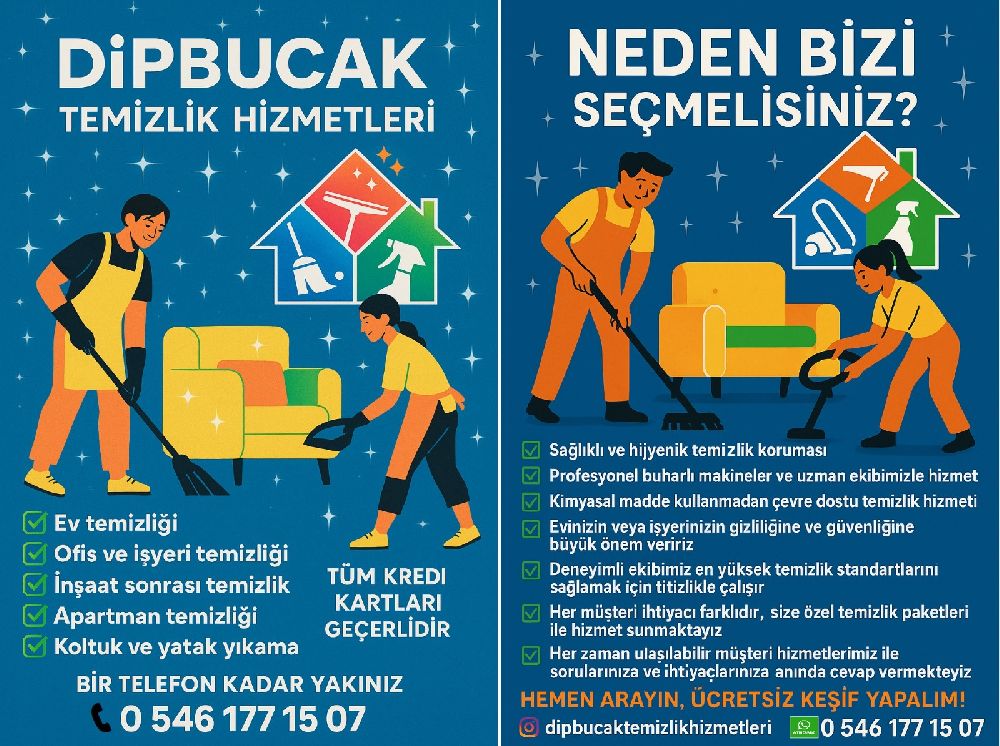 Burdur’un Bucak ilçesinde hizmet veren DipBucak Temizlik Hizmetleri, ev, ofis ve apartmanlara yönelik sunduğu profesyonel çözümlerle hijyen anlayışına yepyeni bir boyut kazandırıyor. İster inşaat sonrası detaylı temizlik, ister koltuk ve yatak yıkama olsun, her ihtiyaca özel çözümlerle temizlik artık çok daha kolay!