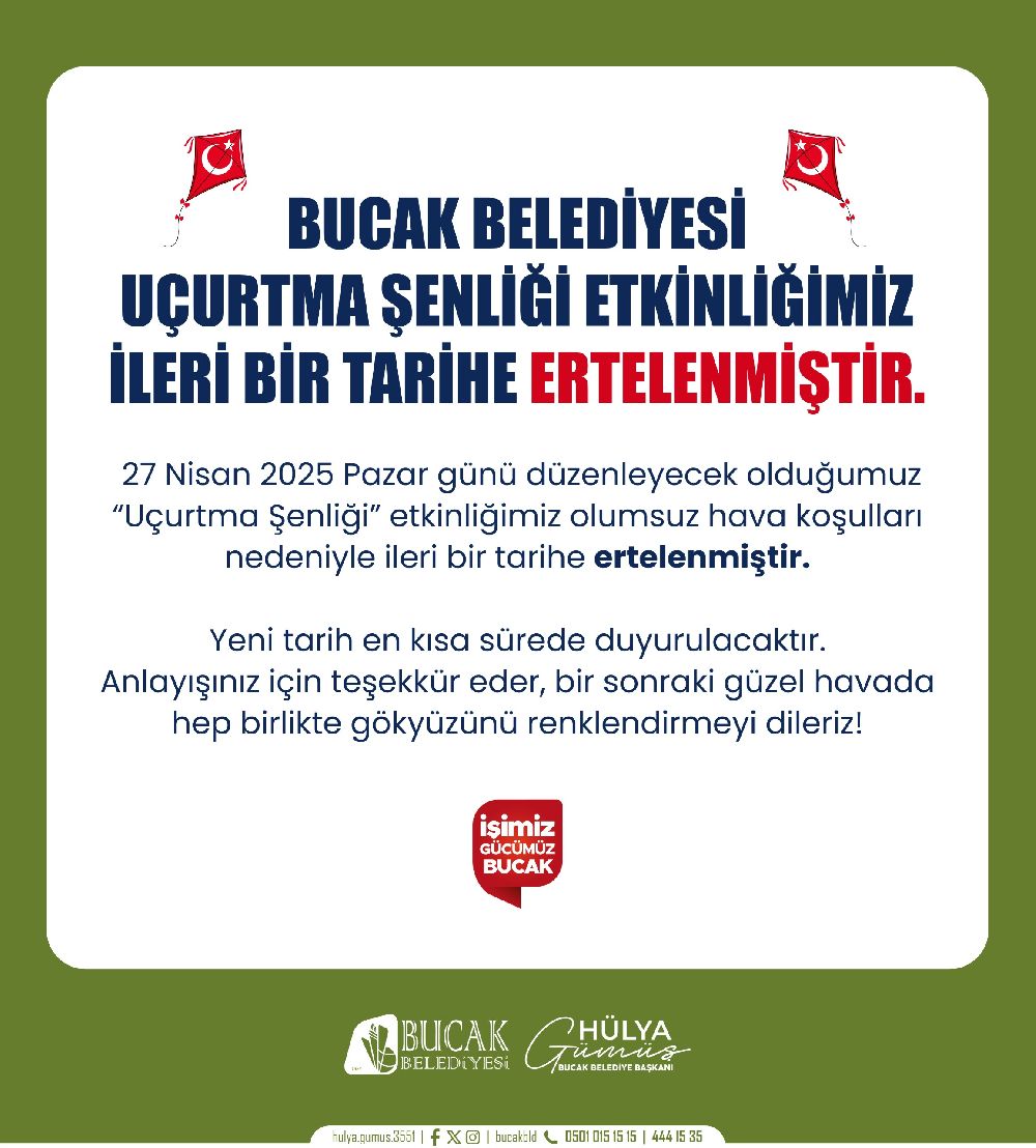 Bucak Belediyesi tarafından yapılan duyuruda, " Bucak Belediyesi olarak 27 Nisan 2025 Pazar günü düzenlemeyi planladığımız Uçurtma Şenliği, olumsuz hava koşulları nedeniyle ileri bir tarihe ertelenmiştir.