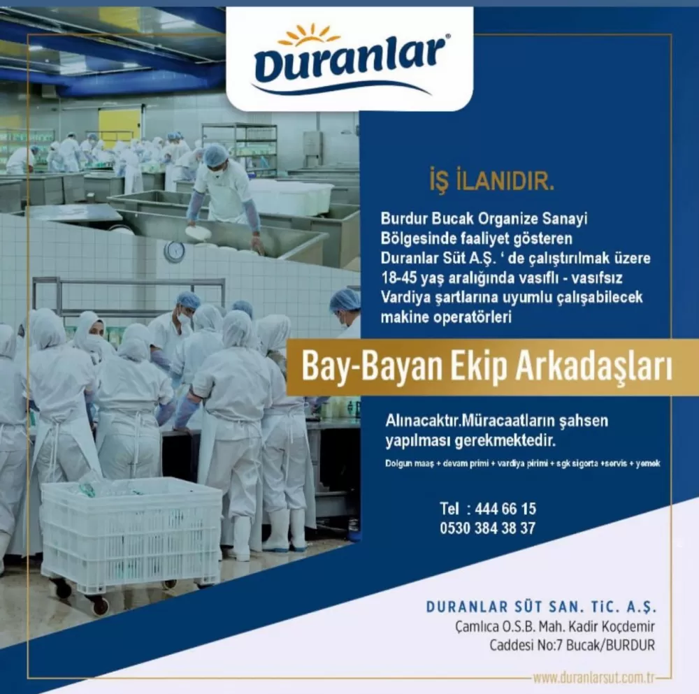 Burdur’un Bucak ilçesinde Organize Sanayi Bölgesinde hizmet vermekte olan Türkiye’nin süt ve süt ürünleri sektöründe önemli firmaları arasında yer alan Duranlar Süt A.Ş., fabrika bünyesinde çalıştırılmak üzere 18–45 yaş aralığında vasıflı veya vasıfsız makine operatörleri alacağını duyurdu.