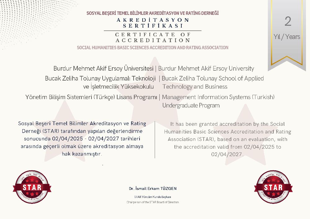 Sosyal Beşeri ve Temel Bilimler Lisans Programları Akreditasyon Kurulu’nun (STARAK) 02.04.2025 tarihli kararıyla, Bucak Zeliha Tolunay Uygulamalı Teknoloji ve İşletmecilik Yüksekokulu, Yönetim Bilişim Sistemleri Bölümü lisans programı STAR Akreditasyon Sertifikası almaya hak kazandı. Yönetim Bilişim Sistemleri Bölümü lisans programı 2 yıl süreyle akredite edildi.