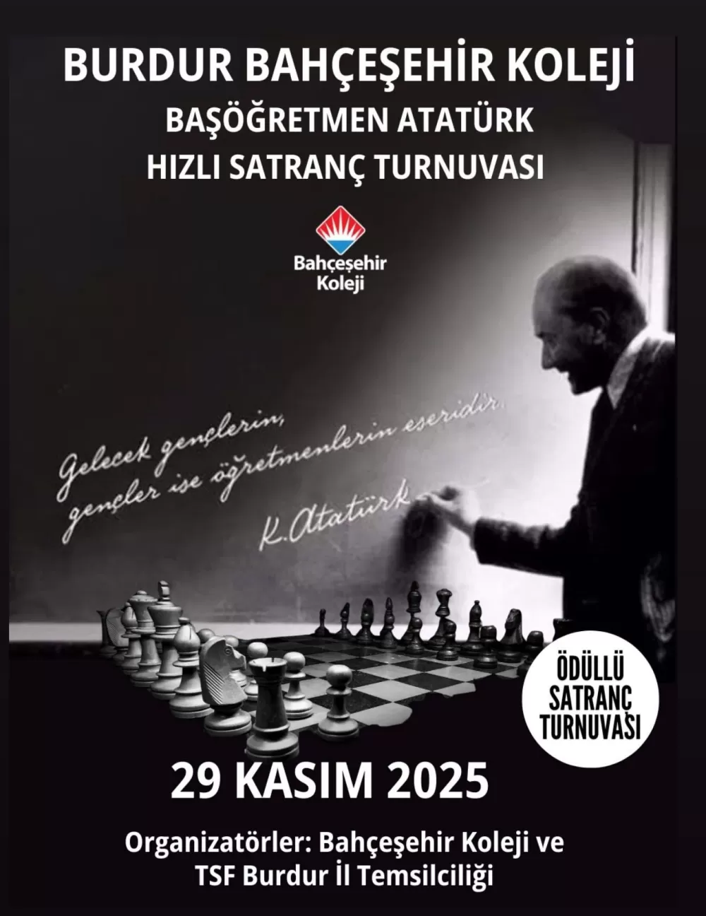 29 Kasım 2025 tarihinde Burdur Bahçeşehir Koleji Kampüsü’nde gerçekleştirilecek turnuva, Başöğretmen Gazi Mustafa Kemal Atatürk’ün eğitim vizyonunu yaşatmayı ve genç nesillere satranç kültürünü kazandırmayı amaçlıyor. Farklı yaş gruplarından öğrencilerin katılımıyla yapılacak müsabakalar, strateji, hızlı düşünme ve problem çözme becerilerini destekleyen önemli bir sportif buluşma niteliği taşıyor.