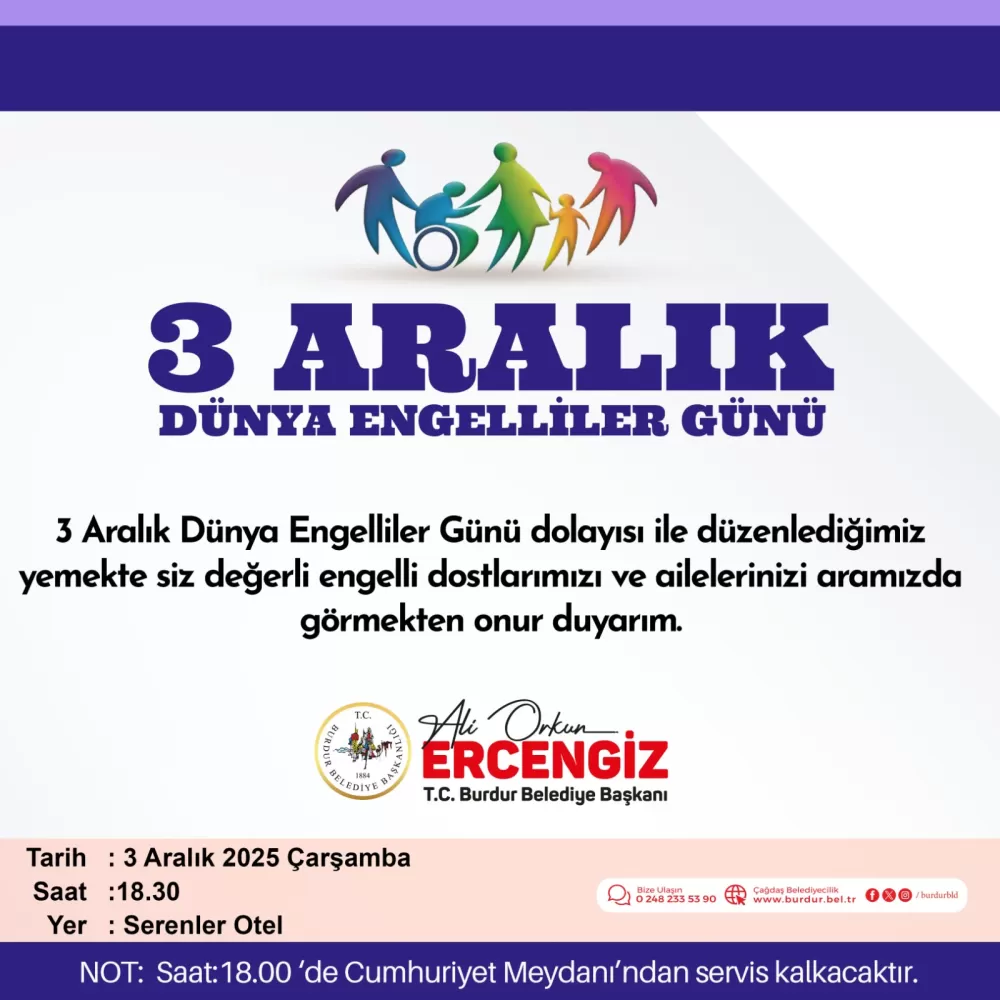 Burdur Belediyesi, 3 Aralık Dünya Engelliler Günü nedeniyle yaptığı açıklamada, engelli bireyler ve aileleriyle bir araya geleceklerini duyurdu. Belediyeden yapılan açıklamada, “Her biri yaşamımıza değer katan engelli bireylerimiz ve aileleriyle buluşuyoruz. Tüm engelli dostlarımızı ve ailelerini bu özel günde aramızda görmekten onur duyarız.” ifadelerine yer verildi.