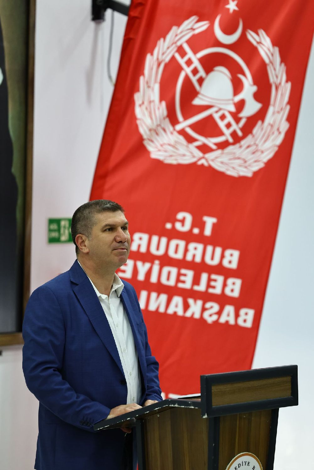 Burdur Belediye başkanı Ali Orkun Ercengiz konuşmasında “Duygusal bir video görüntüsüyle başladık işe. O günleri anbean yaşamış, sürekli takip etmeye çalışmış ve itfaiyeci arkadaşlarımızın insan yaşamına dokunan, insan yaşamını değiştiren adeta insanı ipin ucundan alıp yaşama bağlayan o görüntüler aslında bugünlerde nasıl bir teşkilata sahip olmamız gerektiğinin göstergesidir.