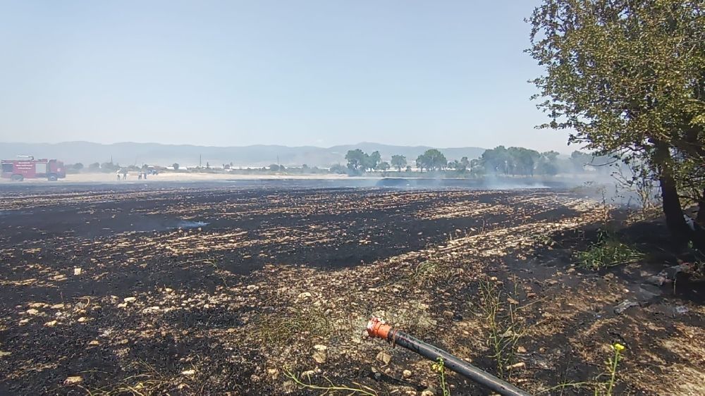 Yangında yaklaşık 10 dönüm anız alan zarar görürken, 3 büyük saman balyası ile 15 adet sulama borusunun da kullanılamaz hale geldiği bildirildi.